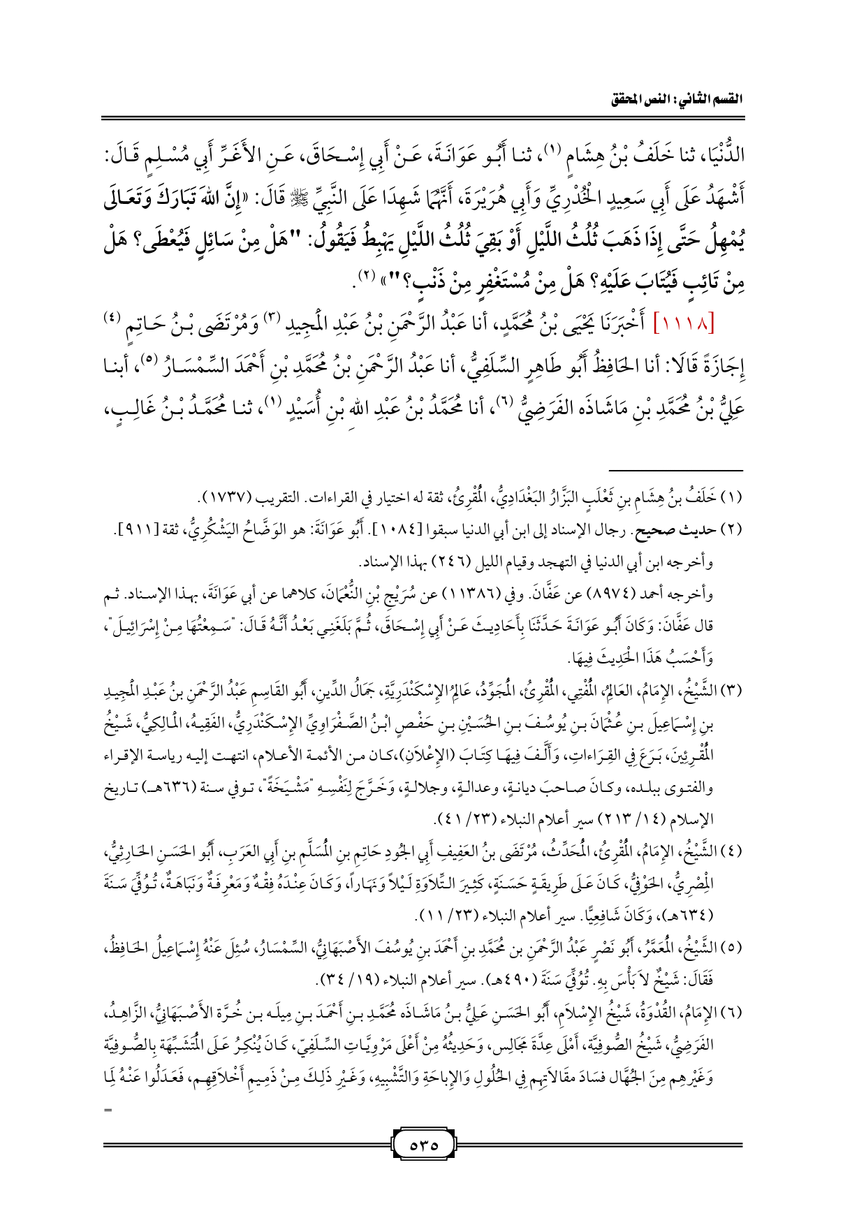 الدُّنْيَا، ثنا خَلَفُ بْنُ هِشَامٍ (¬١)، ثنا أَبُو عَوَانَةَ، عَنْ أَبِي إِسْحَاقَ، عَنِ الأَغَرِّ أَبِي مُسْلِمٍ قَالَ: أَشْهَدُ عَلَى أَبِي سَعِيدٍ الْخُدْرِيِّ وَأَبِي هُرَيْرَةَ، أَنَّهُمَا شَهِدَا عَلَى النَّبِيِّ - صلى الله عليه وسلم - قَالَ: «إِنَّ اللهَ تَبَارَكَ وَتَعَالَى يُمْهِلُ حَتَّى إِذَا ذَهَبَ ثُلُثُ اللَّيْلِ أَوْ بَقِيَ ثُلُثُ اللَّيْلِ يَهْبِطُ فَيَقُولُ: "هَلْ مِنْ سَائِلٍ فَيُعْطَى؟ هَلْ مِنْ تَائِبٍ فَيُتَابَ عَلَيْهِ؟ هَلْ مِنْ مُسْتَغْفِرٍ مِنْ ذَنْبٍ؟ "» (¬٢).