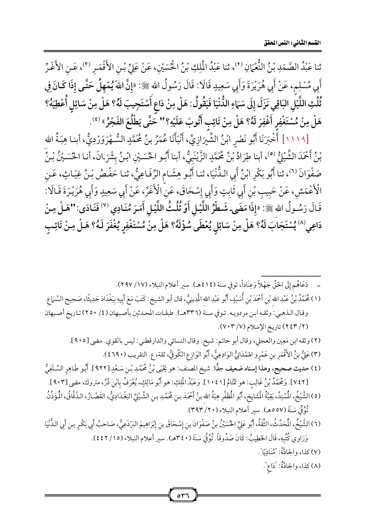 [١١١٩] أَخْبَرَنَا أَبُو نَصْرٍ ابْنُ الشِّيرَازِيِّ، أَنْبَأَنَا عُمَرُ بنُ مُحَمَّدٍ السُّهْرَوَرْدِيُّ، أبنا هِبَةُ اللهِ بْنُ أَحْمَدَ الشِّبْلِيُّ (¬٤)، أبنا طِرَادُ بْنُ مُحَمَّدٍ الزَّيْنَبِيُّ، أبنا أَبُو الحُسَيْنِ ابْنُ بِشْرَانَ، أنا الحُسَيْنُ بْنُ صَفْوَانَ (¬٥)، ثنا أَبُو بَكْرِ ابْنُ أَبِي الدُّنْيَا، ثنا أَبُو هِشَامٍ الرِّفَاعِيُّ، ثنا حَفْصُ بْنُ غِيَاثٍ، عَنِ الْأَعْمَشِ، عَنْ حَبِيبِ بْنِ أَبِي ثَابِتٍ وَأَبِي إِسْحَاقَ، عَنِ الْأَغَرِّ، عَنْ أَبِي سَعِيدٍ وَأَبِي هُرَيْرَةَ قَالَا: قَالَ رَسُولُ اللهِ - صلى الله عليه وسلم -: «إِذَا مَضَى شَطْرُ اللَّيْلِ أَوْ ثُلُثُ اللَّيْلِ أَمَرَ مُنَادِي (¬٦) فَنَادَى: "هَلْ مِنْ دَاعِي (¬٧) يُسْتَجَابَ لَهُ؟ هَلْ مِنْ سَائِلٍ يُعْطَى سُؤْلَهُ؟ هَلْ مِنْ مُسْتَغْفِرٍ يُغْفَرَ لَهُ؟ هَلْ مِنْ تَائِبٍ