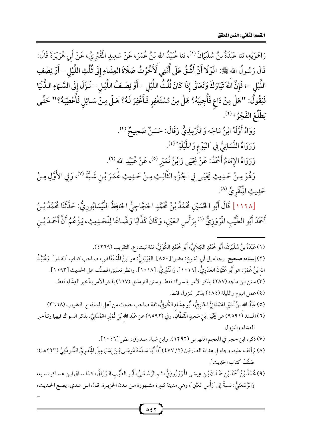 رَاهَوَيْهِ، ثنا عَبْدَةُ بنُ سُلَيْمَانَ (¬١)، ثنا عُبَيْدُ اللهِ بْنُ عُمَرَ، عَنْ سَعِيدٍ الْمَقْبُرِيِّ، عَنْ أَبِي هُرَيْرَةَ قَالَ: قَالَ رَسُولُ اللهِ - صلى الله عليه وسلم -: «لَوْلَا أَنْ أَشُقَّ عَلَى أُمَّتِي لَأَخَّرْتُ صَلَاةَ العِشَاءِ إِلَى ثُلُثِ اللَّيْلِ - أَوْ نِصْفِ اللَّيْلِ -؛ فَإِنَّ اللهَ تَبَارَكَ وَتَعَالَى إِذَا كَانَ ثُلُثُ اللَّيْلِ - أَوْ نِصْفُ اللَّيْلِ - نَزَلَ إِلَى السَّمَاءِ الدُّنْيَا فَيَقُولُ: "هَلْ مِنْ دَاعٍ فَأُجِيبَهُ؟ هَلْ مِنْ مُسْتَغْفِرٍ فَأَغْفِرَ لَهُ؟ هَلْ مِنْ سَائِلٍ فَأُعْطِيَهُ؟ " حَتَّى يَطْلُعَ الفَجْرُ» (¬٢).