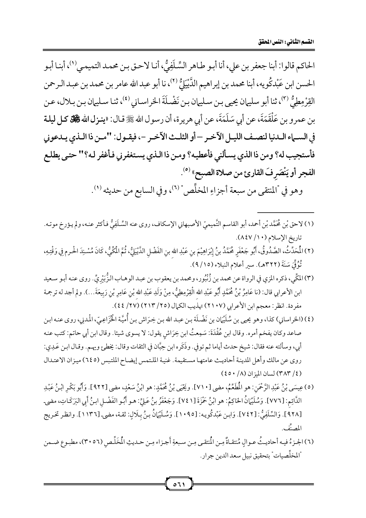 الحاكم قالوا: أبنا جعفر بن علي، أنا أبو طاهر السِّلَفِيُّ، أنا لاحق بن محمد التميمي (¬١)، أبنا أبو الحسن ابن عَبْدكُويه، أبنا محمد بن إبراهيم الدَّيْبَلِيُّ (¬٢)، نا أبو عبد الله عامر بن محمد بن عبد الرحمن القِرْمِطِيُّ (¬٣)، ثنا أبو سليمان يحيى بن سليمان بن نَضْلَةَ الخراساني (¬٤)، ثنا سليمان بن بلال، عن محمد بن عمرو بن عَلْقَمَةَ، عن أبي سَلَمَةَ، عن أبي هريرة، أن رسول الله - صلى الله عليه وسلم - قال: «ينزل الله - عز وجل - كل ليلة في السماء الدنيا لنصف الليل الآخر - أو الثلث الآخر -، فيقول: "من ذا الذي يدعوني فأستجيب له؟ ومن ذا الذي يسألني فأعطيه؟ ومن ذا الذي يستغفرني فأغفر له؟ " حتى يطلع الفجر أو يَنْصَرِفَ القارئ من صلاة الصبح» (¬٥).