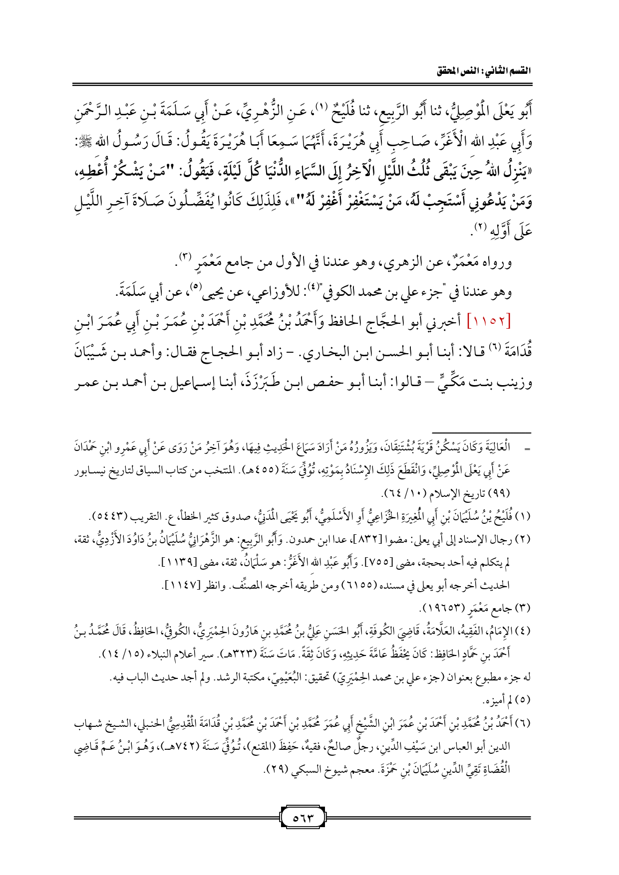 أَبُو يَعْلَى الْمَوْصِلِيُّ، ثنا أَبُو الرَّبِيعِ، ثنا فُلَيْحٌ (¬١)، عَنِ الزُّهْرِيِّ، عَنْ أَبِي سَلَمَةَ بْنِ عَبْدِ الرَّحْمَنِ وَأَبِي عَبْدِ اللهِ الْأَغَرِّ، صَاحِبِ أَبِي هُرَيْرَةَ، أَنَّهُمَا سَمِعَا أَبَا هُرَيْرَةَ يَقُولُ: قَالَ رَسُولُ اللهِ - صلى الله عليه وسلم -: «يَنْزِلُ اللهُ حِينَ يَبْقَى ثُلُثُ اللَّيْلِ الْآخِرُ إِلَى السَّمَاءِ الدُّنْيَا كُلَّ لَيْلَةٍ، فَيَقُولُ: "مَنْ يَشْكُرْ أُعْطِهِ، وَمَنْ يَدْعُونِي أَسْتَجِبْ لَهُ، مَنْ يَسْتَغْفِرْ أَغْفِرْ لَهُ"»، فَلِذَلِكَ كَانُوا يُفَضِّلُونَ صَلَاةَ آخِرِ اللَّيْلِ عَلَى أَوَّلِهِ (¬٢).