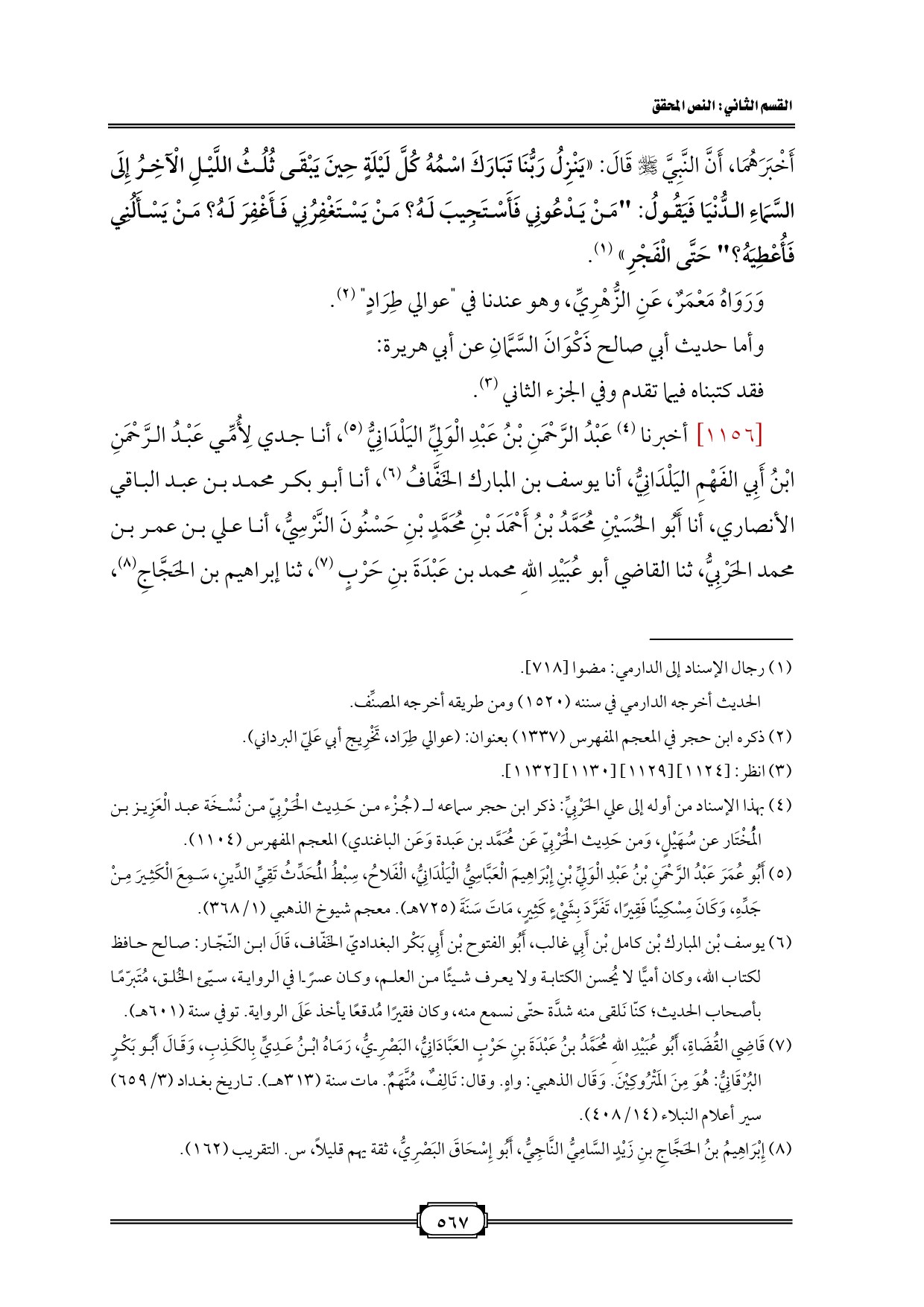 [١١٥٦] أخبرنا (¬٤) عَبْدُ الرَّحْمَنِ بْنُ عَبْدِ الْوَلِيِّ اليَلْدَانِيُّ (¬٥)، أنا جدي لِأُمِّي عَبْدُ الرَّحْمَنِ ابْنُ أَبِي الفَهْمِ اليَلْدَانِيُّ، أنا يوسف بن المبارك الخَفَّافُ (¬٦)، أنا أبو بكر محمد بن عبد الباقي الأنصاري، أنا أَبُو الحُسَيْنِ مُحَمَّدُ بْنُ أَحْمَدَ بْنِ مُحَمَّدٍ بْنِ حَسْنُونَ النَّرْسِيُّ، أنا علي بن عمر بن محمد الحَرْبِيُّ، ثنا القاضي أبو عُبَيْدِ اللهِ محمد بن عَبْدَةَ بنِ حَرْبٍ (¬٧)، ثنا إبراهيم بن الحَجَّاجِ (¬٨)،