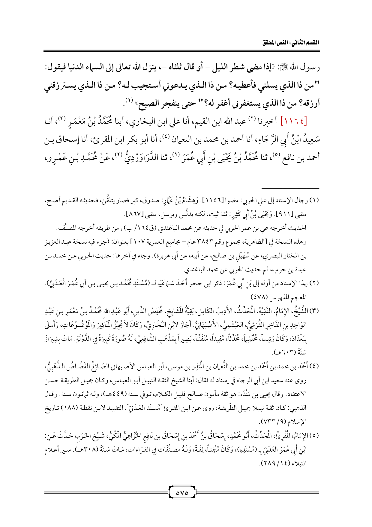 [١١٦٤] أخبرنا (¬٢) عبد الله ابن القيم، أنا علي ابن البخاري، أبنا مُحَمَّدُ بْنُ مَعْمَرٍ (¬٣)، أنا سَعِيدُ ابْنُ أَبِي الرَّجَاءِ، أنا أحمد بن محمد بن النعمان (¬٤)، أنا أبو بكر ابن المقرئ، أنا إسحاق بن أحمد بن نافع (¬٥)، ثنا مُحَمَّدُ بْنُ يَحْيَى بْنِ أَبِي عُمَرَ (¬٦)، ثنا الدَّرَاوَرْدِيُّ (¬٧)، عَنْ مُحَمَّدِ بْنِ عَمْرٍو،