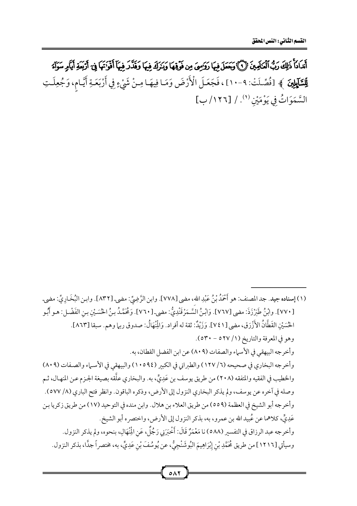 أَنْدَادًا ذَلِكَ رَبُّ الْعَالَمِينَ (٩) وَجَعَلَ فِيهَا رَوَاسِيَ مِنْ فَوْقِهَا وَبَارَكَ فِيهَا وَقَدَّرَ فِيهَا أَقْوَاتَهَا فِي أَرْبَعَةِ أَيَّامٍ سَوَاءً لِلسَّائِلِينَ} [فُصِّلَتْ: ٩ - ١٠]، فَجَعَلَ الْأَرْضَ وَمَا فِيهَا مِنْ شَيْءٍ فِي أَرْبَعَةِ أَيَّامٍ، وَجُعِلَتِ السَّمَوَاتُ فِي يَوْمَيْنِ (¬١). / [١٢٦/ب]