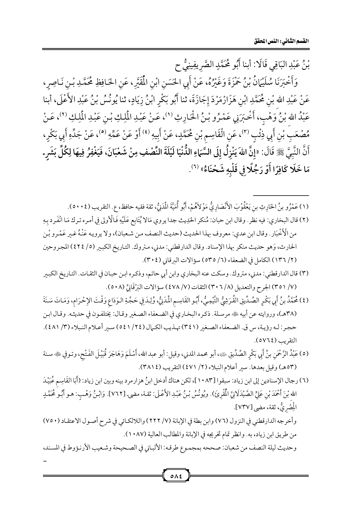 وَأَخْبَرَنَا سُلَيْمَانُ بْنُ حَمْزَةَ وَغَيْرُهُ، عَنْ أَبِي الحَسَنِ ابْنِ الْمُقَيَّرِ، عَنِ الحَافِظِ مُحَمَّدِ بْنِ نَاصِرٍ، عَنْ عَبْدِ اللهِ بْنِ مُحَمَّدِ ابْنِ هَزَارْمَرْدَ إِجَازَةً، ثنا أَبُو بَكْرٍ ابْنُ زِيَادٍ، ثنا يُونُسُ بْنُ عَبْدِ الأَعْلَى، أبنا عَبْدُ اللهِ بْنُ وَهْبٍ، أَخْبَرَنِي عَمْرُو بْنُ الْحَارِثِ (¬١)، عَنْ عَبْدِ الْمَلِكِ بْنِ عَبْدِ الْمَلِكِ (¬٢)، عَنْ مُصْعَبِ بْنِ أَبِي ذِئْبٍ (¬٣)، عَنِ الْقَاسِمِ بْنِ مُحَمَّدٍ، عَنْ أَبِيهِ (¬٤) أَوْ عَنْ عَمِّهِ (¬٥)، عَنْ جَدِّهِ أَبِي بَكْرٍ، أَنَّ النَّبِيَّ - صلى الله عليه وسلم - قَالَ: «إِنَّ اللهَ يَنْزِلُ إِلَى السَّمَاءِ الدُّنْيَا لَيْلَةَ النِّصْفِ مِنْ شَعْبَانَ، فَيَغْفِرُ فِيهَا لِكُلِّ بَشَرٍ مَا خَلَا كَافِرًا أَوْ رَجُلًا فِي قَلْبِهِ شَحْنَاءُ» (¬٦).