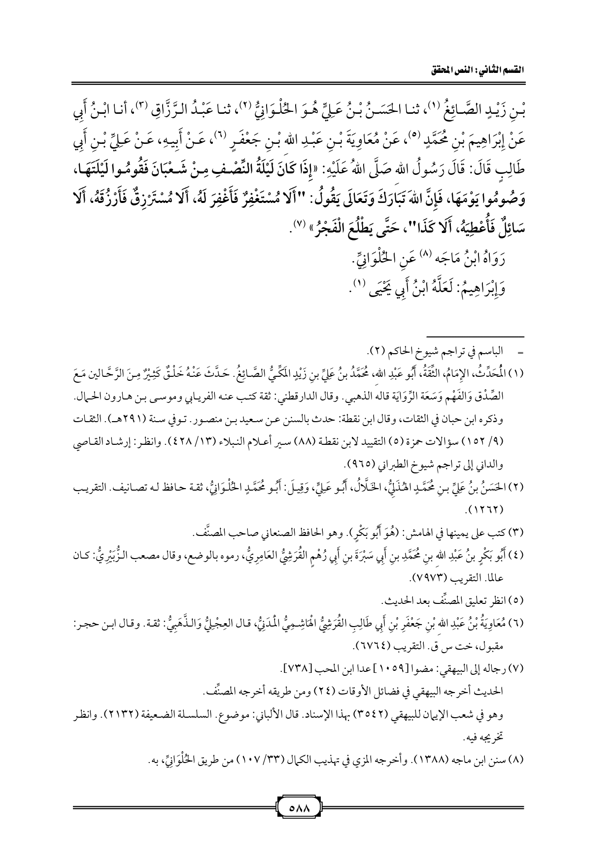 بْنِ زَيْدٍ الصَّائِغُ (¬١)، ثنا الحَسَنُ بْنُ عَلِيٍّ هُوَ الحُلْوَانِيُّ (¬٢)، ثنا عَبْدُ الرَّزَّاقِ (¬٣)، أنا ابْنُ أَبِي سَبْرَةَ (¬٤)، عَنْ إِبْرَاهِيمَ بْنِ مُحَمَّدٍ (¬٥)، عَنْ مُعَاوِيَةَ بْنِ عَبْدِ اللهِ بْنِ جَعْفَرٍ (¬٦)، عَنْ أَبِيهِ، عَنْ عَلِيِّ بْنِ أَبِي طَالِبٍ قَالَ: قَالَ رَسُولُ اللهِ صَلَّى اللهُ عَلَيْهِ: «إِذَا كَانَ لَيْلَةُ النِّصْفِ مِنْ شَعْبَانَ فَقُومُوا لَيْلَتَهَا، وَصُومُوا يَوْمَهَا، فَإِنَّ اللهَ تَبَارَكَ وَتَعَالَى يَقُولُ: "أَلَا مُسْتَغْفِرٌ فَأَغْفِرَ لَهُ، أَلَا مُسْتَرْزِقٌ فَأَرْزُقَهُ، أَلَا سَائِلٌ فَأُعْطِيَهُ، أَلَا كَذَا"، حَتَّى يَطْلُعَ الْفَجْرُ» (¬٧).