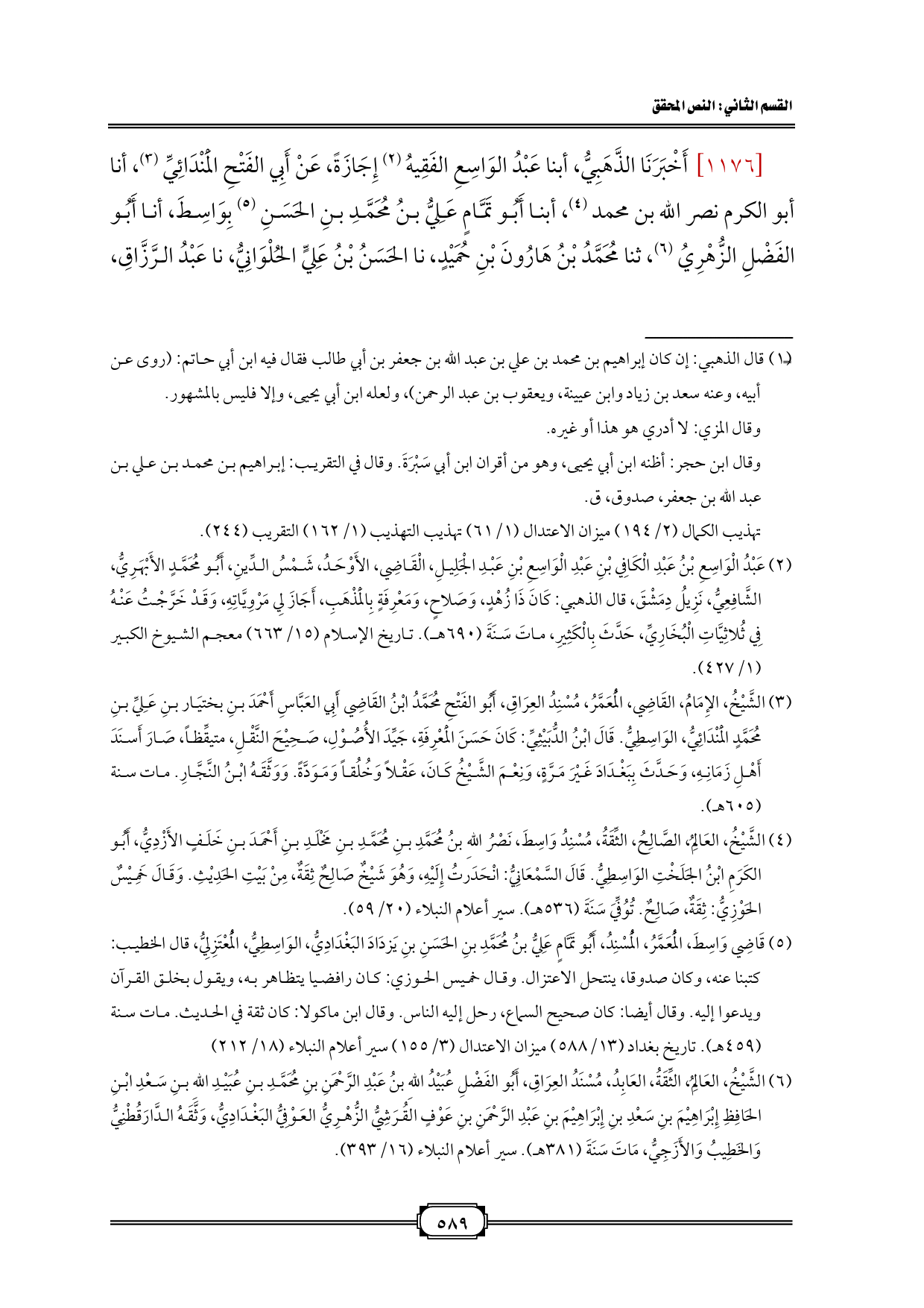 [١١٧٦] أَخْبَرَنَا الذَّهَبِيُّ، أبنا عَبْدُ الوَاسِعِ الفَقِيهُ (¬١) إِجَازَةً، عَنْ أَبِي الفَتْحِ الْمَنْدَائِيِّ (¬٢)، أنا أبو الكرم نصر الله بن محمد (¬٣)، أبنا أَبُو تَمَّامٍ عَلِيُّ بنُ مُحَمَّدِ بنِ الحَسَنِ (¬٤) بِوَاسِطَ، أنا أَبُو الفَضْلِ الزُّهْرِيُ (¬٥)، ثنا مُحَمَّدُ بْنُ هَارُونَ بْنِ حُمَيْدٍ، نا الحَسَنُ بْنُ عَلِيٍّ الحُلْوَانِيُّ، نا عَبْدُ الرَّزَّاقِ،