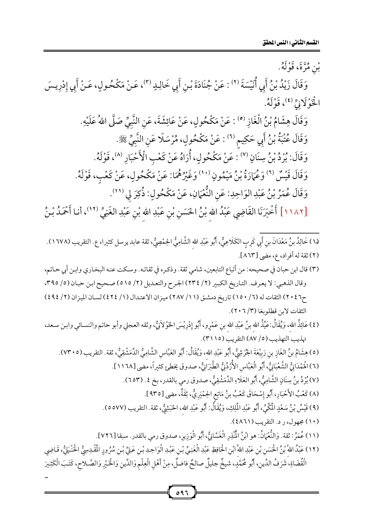 (¬٢) قال ابن حبان في صحيحه: من أتباع التابعين، شامي ثقة. وذكره في ثقاته. وسكت عنه البخاري وابن أبي حاتم، وقال الذهبي: لا يعرف. التاريخ الكبير (٢/ ٢٣٤) الجرح والتعديل (٢/ ٥١٥) صحيح ابن حبان (٥/ ٣٩٥، ح ٢٠٤٦) الثقات له (٦/ ١٥٠) تاريخ دمشق (١١/ ٢٨٧) ميزان الاعتدال (١/ ٤٢٤) لسان الميزان (٢/ ٤٩٤) الثقات لابن قطلوبغا (٣/ ٢٠٦).