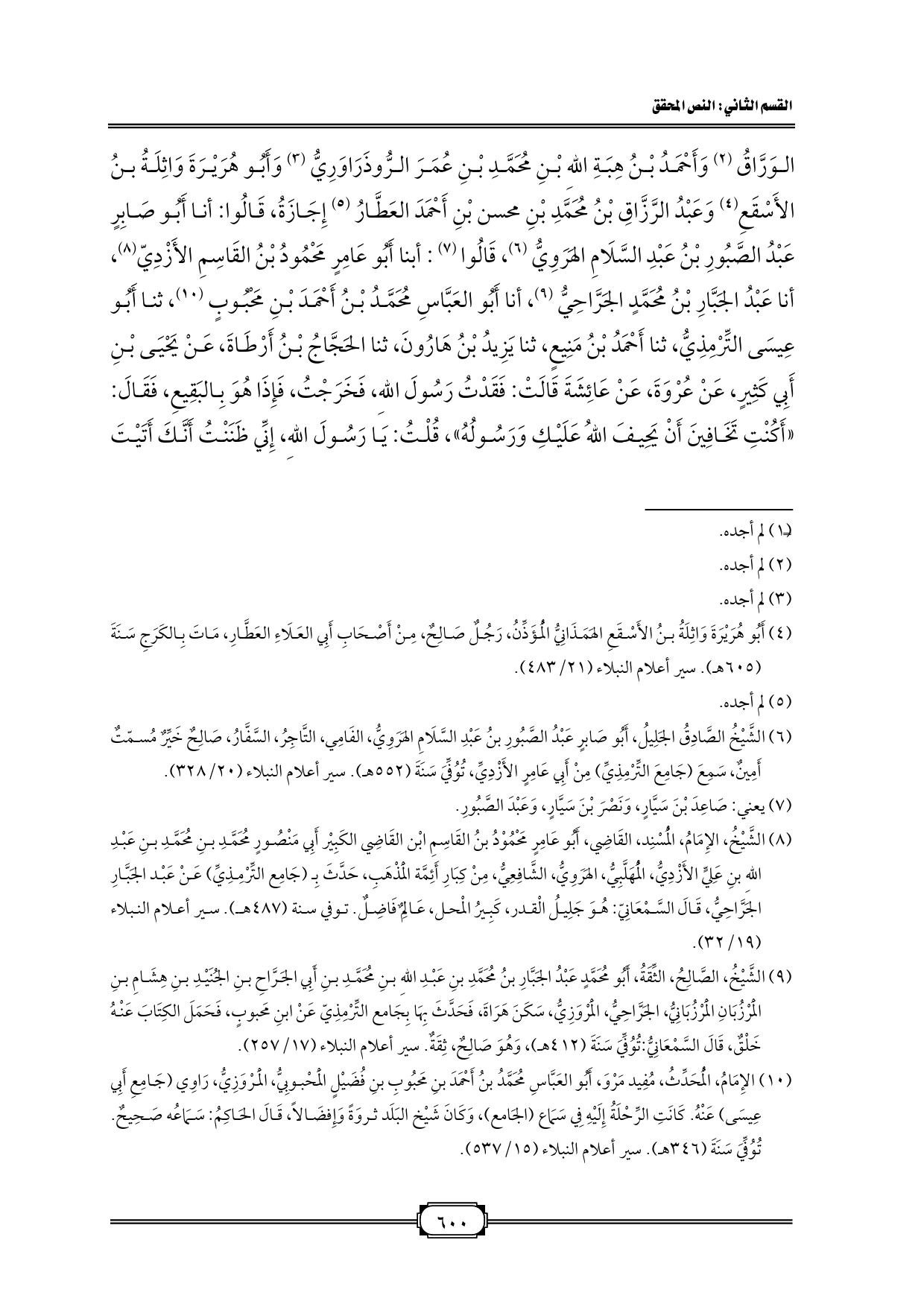 الوَرَّاقُ (¬١) وَأَحْمَدُ بْنُ هِبَةِ اللهِ بْنِ مُحَمَّدِ بْنِ عُمَرَ الرُّوذَرَاوَرِيُّ (¬٢) وَأَبُو هُرَيْرَةَ وَاثِلَةُ بنُ الأَسْقَعِ (¬٣) وَعَبْدُ الرَّزَّاقِ بْنُ مُحَمَّدِ بْنِ محسن بْنِ أَحْمَدَ العَطَّارُ (¬٤) إِجَازَةُ، قَالُوا: أنا أَبُو صَابِرٍ عَبْدُ الصَّبُورِ بْنُ عَبْدِ السَّلَامِ الهَرَوِيُّ (¬٥)، قَالُوا (¬٦): أبنا أَبُو عَامِرٍ مَحْمُودُ بْنُ القَاسِمِ الأَزْدِيّ (¬٧)، أنا عَبْدُ الجَبَّارِ بْنُ مُحَمَّدٍ الجَرَّاحِيُّ (¬٨)، أنا أَبُو العَبَّاسِ مُحَمَّدُ بْنُ أَحْمَدَ بْنِ مَحْبُوبٍ (¬٩)، ثنا أَبُو عِيسَى التِّرْمِذِيُّ، ثنا أَحْمَدُ بْنُ مَنِيعٍ، ثنا يَزِيدُ بْنُ هَارُونَ، ثنا الحَجَّاجُ بْنُ أَرْطَاةَ، عَنْ يَحْيَى بْنِ أَبِي كَثِيرٍ، عَنْ عُرْوَةَ، عَنْ عَائِشَةَ قَالَتْ: فَقَدْتُ رَسُولَ اللهِ، فَخَرَجْتُ، فَإِذَا هُوَ بِالبَقِيعِ، فَقَالَ: «أَكُنْتِ تَخَافِينَ أَنْ يَحِيفَ اللهُ عَلَيْكِ وَرَسُولُهُ»، قُلْتُ: يَا رَسُولَ اللهِ، إِنِّي ظَنَنْتُ أَنَّكَ أَتَيْتَ