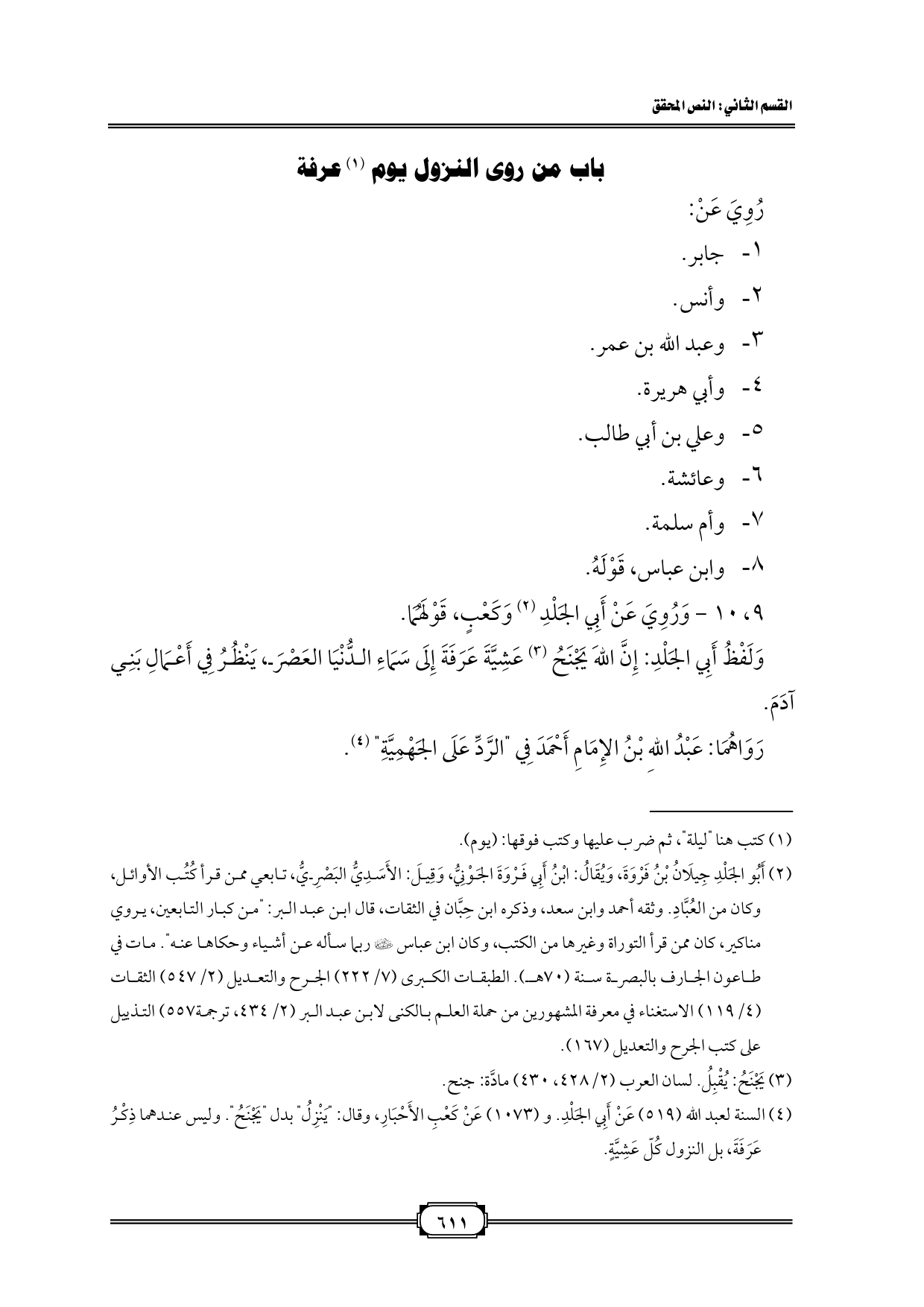 (¬٤) السنة لعبد الله (٥١٩) عَنْ أَبِي الجَلْدِ. و (١٠٧٣) عَنْ كَعْبِ الأَحْبَارِ، وقال: "يَنْزِلُ" بدل "يَجْنَحُ". وليس عندهما ذِكْرُ عَرَفَةَ، بل النزول كُلّ عَشِيَّةٍ.