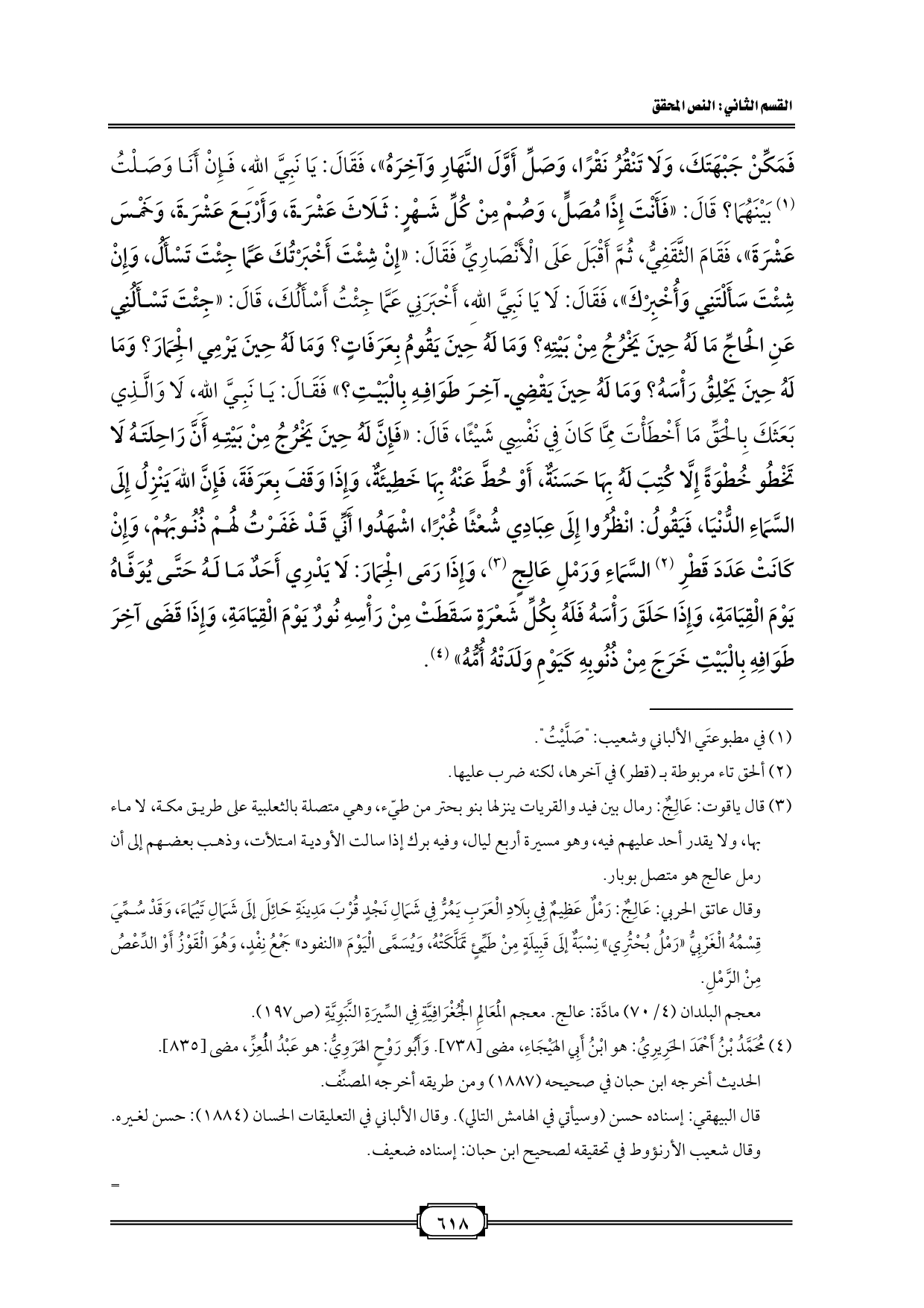 فَمَكِّنْ جَبْهَتَكَ، وَلَا تَنْقُرُ نَقْرًا، وَصَلِّ أَوَّلَ النَّهَارِ وَآخِرَهُ»، فَقَالَ: يَا نَبِيَّ اللهِ، فَإِنْ أَنَا وَصَلْتُ (¬١) بَيْنَهُمَا؟ قَالَ: «فَأَنْتَ إِذًا مُصَلٍّ، وَصُمْ مِنْ كُلِّ شَهْرٍ: ثَلَاثَ عَشْرَةَ، وَأَرْبَعَ عَشْرَةَ، وَخَمْسَ عَشْرَةَ»، فَقَامَ الثَّقَفِيُّ، ثُمَّ أَقْبَلَ عَلَى الْأَنْصَارِيِّ فَقَالَ: «إِنْ شِئْتَ أَخْبَرْتُكَ عَمَّا جِئْتَ تَسْأَلُ، وَإِنْ شِئْتَ سَأَلْتَنِي وَأُخْبِرْكَ»، فَقَالَ: لَا يَا نَبِيَّ اللهِ، أَخْبَرَنِي عَمَّا جِئْتُ أَسْأَلُكَ، قَالَ: «جِئْتَ تَسْأَلُنِي عَنِ الْحَاجِّ مَا لَهُ حِينَ يَخْرُجُ مِنْ بَيْتِهِ؟ وَمَا لَهُ حِينَ يَقُومُ بِعَرَفَاتٍ؟ وَمَا لَهُ حِينَ يَرْمِي الْجِمَارَ؟ وَمَا لَهُ حِينَ يَحْلِقُ رَأْسَهُ؟ وَمَا لَهُ حِينَ يَقْضِي آخِرَ طَوَافِهِ بِالْبَيْتِ؟» فَقَالَ: يَا نَبِيَّ اللهِ، لَا وَالَّذِي بَعَثَكَ بِالْحَقِّ مَا أَخْطَأْتَ مِمَّا كَانَ فِي نَفْسِي شَيْئًا، قَالَ: «فَإِنَّ لَهُ حِينَ يَخْرُجُ مِنْ بَيْتِهِ أَنَّ رَاحِلَتَهُ لَا تَخْطُو خُطْوَةً إِلَّا كُتِبَ لَهُ بِهَا حَسَنَةٌ، أَوْ حُطَّ عَنْهُ بِهَا خَطِيئَةٌ، وَإِذَا وَقَفَ بِعَرَفَةَ، فَإِنَّ اللهَ يَنْزِلُ إِلَى السَّمَاءِ الدُّنْيَا، فَيَقُولُ: انْظُرُوا إِلَى عِبَادِي شُعْثًا غُبْرًا، اشْهَدُوا أَنِّي قَدْ غَفَرْتُ لَهُمْ ذُنُوبَهُمْ، وَإِنْ كَانَتْ عَدَدَ قَطْرِ (¬٢) السَّمَاءِ وَرَمْلِ عَالِجٍ (¬٣)، وَإِذَا رَمَى الْجِمَارَ: لَا يَدْرِي أَحَدٌ مَا لَهُ حَتَّى يُوَفَّاهُ يَوْمَ الْقِيَامَةِ، وَإِذَا حَلَقَ رَأْسَهُ فَلَهُ بِكُلِّ شَعْرَةٍ سَقَطَتْ مِنْ رَأْسِهِ نُورٌ يَوْمَ الْقِيَامَةِ، وَإِذَا قَضَى آخِرَ طَوَافِهِ بِالْبَيْتِ خَرَجَ مِنْ ذُنُوبِهِ كَيَوْمِ وَلَدَتْهُ أُمُّهُ» (¬٤).