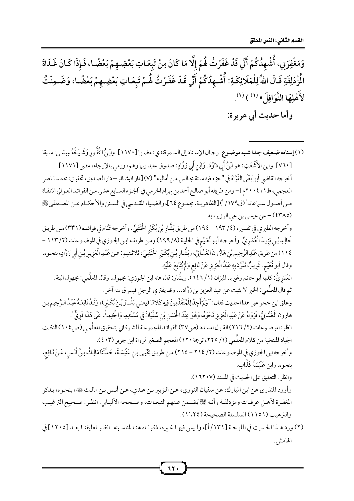 (¬١) إسناده ضعيف جدا شبه موضوع. رجال الإسناد إلى السمرقندي: مضوا [١١٧٠]. وابْنُ النَّقُّورِ وَشَيْخُهُ عِيسَى: سبقا [٧٦٠]. وابن الأَشْعَثِ: هو ابْنُ أَبِي دَاوُدَ. وَابْنِ أَبِي رَوَّادٍ: صدوق عابد ربما وهم، ورمي بالإرجاء، مضى [١١٧١].