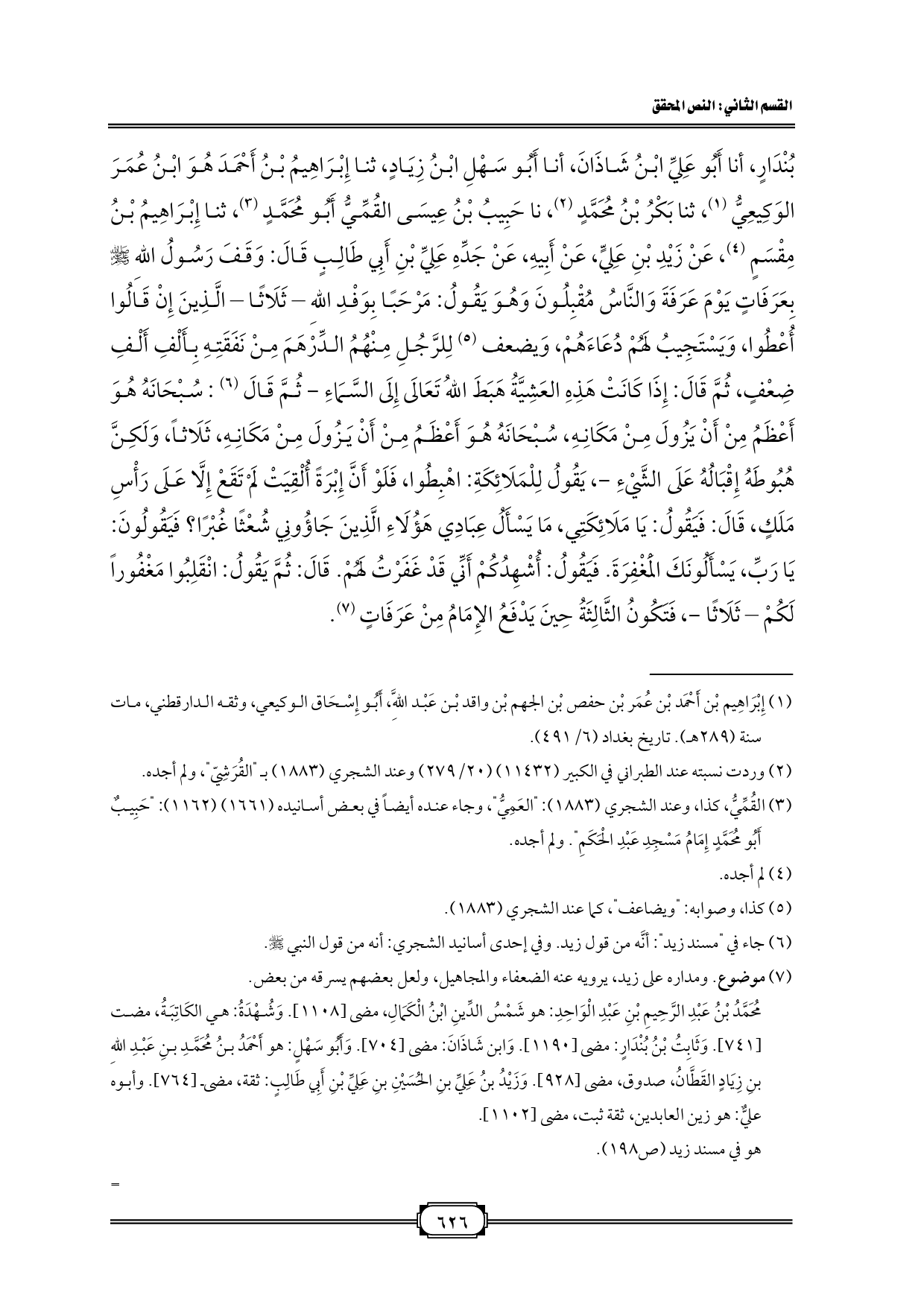 بُنْدَارٍ، أنا أَبُو عَلِيِّ ابْنُ شَاذَانَ، أنا أَبُو سَهْلِ ابْنُ زِيَادٍ، ثنا إِبْرَاهِيمُ بْنُ أَحْمَدَ هُوَ ابْنُ عُمَرَ الوَكِيعِيُّ (¬١)، ثنا بَكْرُ بْنُ مُحَمَّدٍ (¬٢)، نا حَبِيبُ بْنُ عِيسَى القُمِّيُّ أَبُو مُحَمَّدٍ (¬٣)، ثنا إِبْرَاهِيمُ بْنُ مِقْسَمٍ (¬٤)، عَنْ زَيْدِ بْنِ عَلِيٍّ، عَنْ أَبِيهِ، عَنْ جَدِّهِ عَلِيِّ بْنِ أَبِي طَالِبٍ قَالَ: وَقَفَ رَسُولُ اللهِ - صلى الله عليه وسلم - بِعَرَفَاتٍ يَوْمَ عَرَفَةَ وَالنَّاسُ مُقْبِلُونَ وَهُوَ يَقُولُ: مَرْحَبًا بِوَفْدِ اللهِ - ثَلَاثًا - الَّذِينَ إِنْ قَالُوا أُعْطُوا، وَيَسْتَجِيبُ لَهُمْ دُعَاءَهُمْ، وَيضعف (¬٥) لِلرَّجُلِ مِنْهُمُ الدِّرْهَمَ مِنْ نَفَقَتِهِ بِأَلْفِ أَلْفِ ضِعْفٍ، ثُمَّ قَالَ: إِذَا كَانَتْ هَذِهِ العَشِيَّةُ هَبَطَ اللهُ تَعَالَى إِلَى السَّمَاءِ - ثُمَّ قَالَ (¬٦): سُبْحَانَهُ هُوَ أَعْظَمُ مِنْ أَنْ يَزُولَ مِنْ مَكَانِهِ، سُبْحَانَهُ هُوَ أَعْظَمُ مِنْ أَنْ يَزُولَ مِنْ مَكَانِهِ، ثَلَاثاً، وَلَكِنَّ هُبُوطَهُ إِقْبَالُهُ عَلَى الشَّيْءِ -، يَقُولُ لِلْمَلَائِكَةِ: اهْبِطُوا، فَلَوْ أَنَّ إِبْرَةً أُلْقِيَتْ لَمْ تَقَعْ إِلَّا عَلَى رَأْسِ مَلَكٍ، قَالَ: فَيَقُولُ: يَا مَلَائِكَتِي، مَا يَسْأَلُ عِبَادِي هَؤُلَاءِ الَّذِينَ جَاؤُونِي شُعْثًا غُبْرًا؟ فَيَقُولُونَ: يَا رَبِّ، يَسْأَلُونَكَ الْمَغْفِرَةَ. فَيَقُولُ: أُشْهِدُكُمْ أَنِّي قَدْ غَفَرْتُ لَهُمْ. قَالَ: ثُمَّ يَقُولُ: انْقَلِبُوا مَغْفُوراً لَكُمْ - ثَلَاثًا -، فَتَكُونُ الثَّالِثَةُ حِينَ يَدْفَعُ الإِمَامُ مِنْ عَرَفَاتٍ (¬٧).