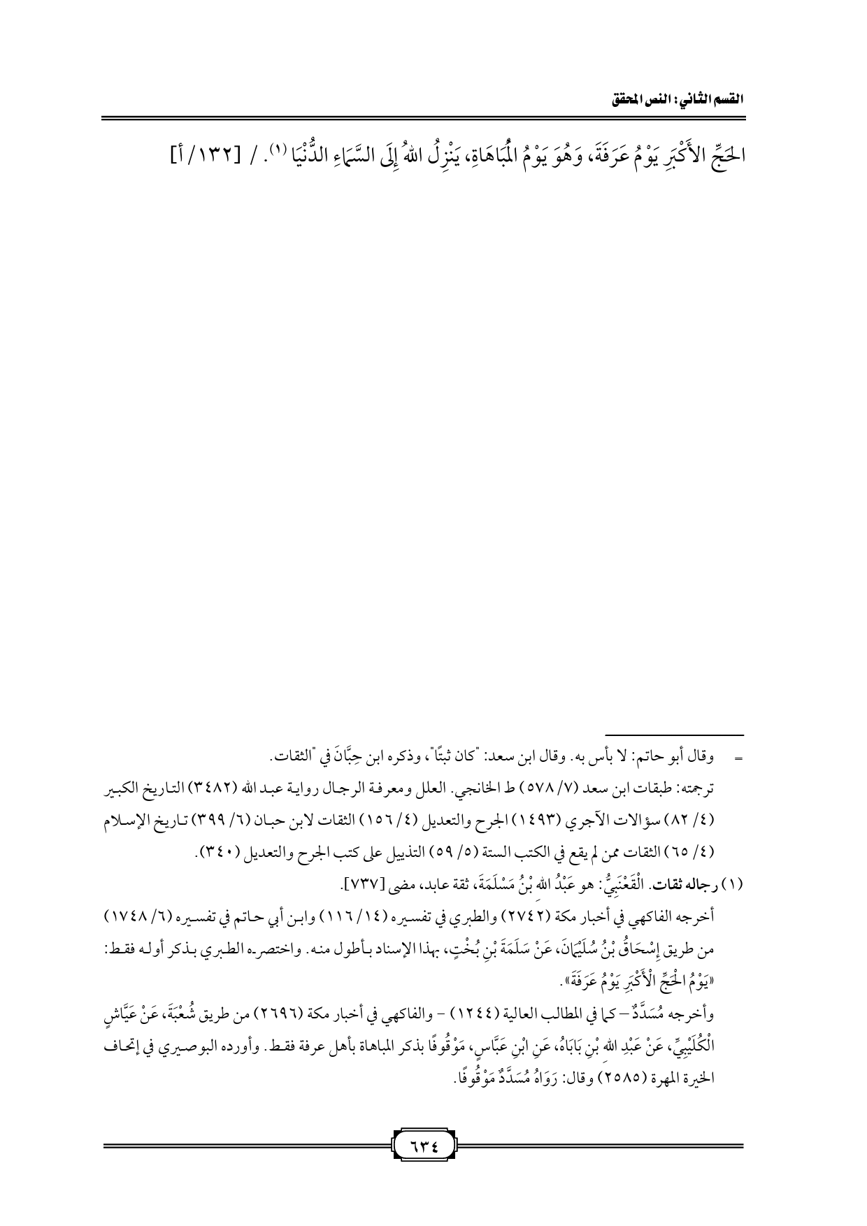 أخرجه الفاكهي في أخبار مكة (٢٧٤٢) والطبري في تفسيره (١٤/ ١١٦) وابن أبي حاتم في تفسيره (٦/ ١٧٤٨) من طريق إِسْحَاقُ بْنُ سُلَيْمَانَ، عَنْ سَلَمَةَ بْنِ بُخْتٍ، بهذا الإسناد بأطول منه. واختصره الطبري بذكر أوله فقط: «يَوْمُ الْحَجِّ الْأَكْبَرِ يَوْمُ عَرَفَةَ».