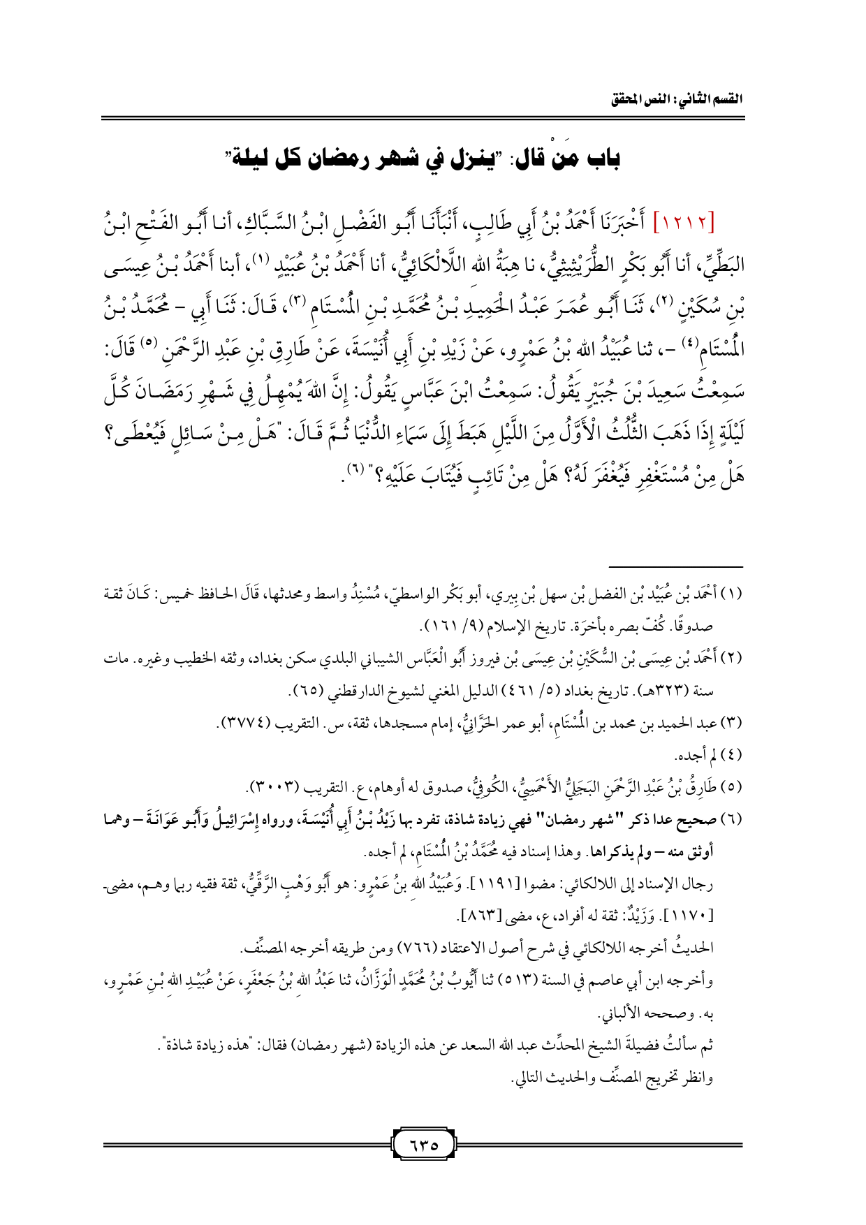 [١٢١٢] أَخْبَرَنَا أَحْمَدُ بْنُ أَبِي طَالِبٍ، أَنْبَأَنَا أَبُو الفَضْلِ ابْنُ السَّبَّاكِ، أنا أَبُو الفَتْحِ ابْنُ البَطِّيِّ، أنا أَبُو بَكْرٍ الطُّرَيْثِيثِيُّ، نا هِبَةُ اللهِ اللَّالْكَائِيُّ، أنا أَحْمَدُ بْنُ عُبَيْدٍ (¬١)، أبنا أَحْمَدُ بْنُ عِيسَى بْنِ سُكَيْنٍ (¬٢)، ثَنَا أَبُو عُمَرَ عَبْدُ الْحَمِيدِ بْنُ مُحَمَّدِ بْنِ الْمُسْتَامِ (¬٣)، قَالَ: ثَنَا أَبِي - مُحَمَّدُ بْنُ الْمُسْتَامِ (¬٤) -، ثنا عُبَيْدُ اللهِ بْنُ عَمْرٍو، عَنْ زَيْدِ بْنِ أَبِي أُنَيْسَةَ، عَنْ طَارِقِ بْنِ عَبْدِ الرَّحْمَنِ (¬٥) قَالَ: سَمِعْتُ سَعِيدَ بْنَ جُبَيْرٍ يَقُولُ: سَمِعْتُ ابْنَ عَبَّاسٍ يَقُولُ: إِنَّ اللهَ يُمْهِلُ فِي شَهْرِ رَمَضَانَ كُلَّ لَيْلَةٍ إِذَا ذَهَبَ الثُّلُثُ الْأَوَّلُ مِنَ اللَّيْلِ هَبَطَ إِلَى سَمَاءِ الدُّنْيَا ثُمَّ قَالَ: "هَلْ مِنْ سَائِلٍ فَيُعْطَى؟ هَلْ مِنْ مُسْتَغْفِرِ فَيُغْفَرَ لَهُ؟ هَلْ مِنْ تَائِبٍ فَيُتَابَ عَلَيْهِ؟ " (¬٦).