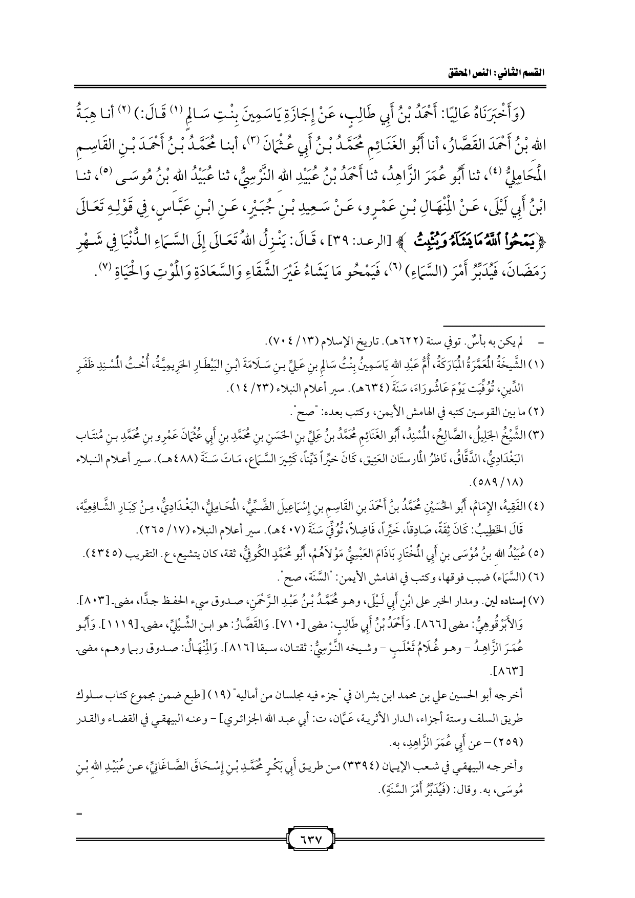 (وَأَخْبَرَنَاهُ عَالِيًا: أَحْمَدُ بْنُ أَبِي طَالِبٍ، عَنْ إِجَازَةِ يَاسَمِينَ بِنْتِ سَالِمٍ (¬١) قَالَ:) (¬٢) أنا هِبَةُ اللهِ بْنُ أَحْمَدَ القَصَّارُ، أنا أَبُو الغَنَائِمِ مُحَمَّدُ بْنُ أَبِي عُثْمَانَ (¬٣)، أبنا مُحَمَّدُ بْنُ أَحْمَدَ بْنِ القَاسِمِ الْمَحَامِلِيُّ (¬٤)، ثنا أَبُو عُمَرَ الزَّاهِدُ، ثنا أَحْمَدُ بْنُ عُبَيْدِ اللهِ النَّرْسِيُّ، ثنا عُبَيْدُ اللهِ بْنُ مُوسَى (¬٥)، ثنا ابْنُ أَبِي لَيْلَى، عَنْ الْمِنْهَالِ بْنِ عَمْرٍو، عَنْ سَعِيدِ بْنِ جُبَيْرٍ، عَنِ ابْنِ عَبَّاسٍ، فِي قَوْلِهِ تَعَالَى {يَمْحُو اللَّهُ مَا يَشَاءُ وَيُثْبِتُ} [الرعد: ٣٩]، قَالَ: يَنْزِلُ اللهُ تَعَالَى إِلَى السَّمَاءِ الدُّنْيَا فِي شَهْرِ رَمَضَانَ، فَيُدَبِّرُ أَمْرَ (السَّمَاءِ) (¬٦)، فَيَمْحُو مَا يَشَاءُ غَيْرَ الشَّقَاءِ وَالسَّعَادَةِ وَالْمَوْتِ وَالْحَيَاةِ (¬٧).
