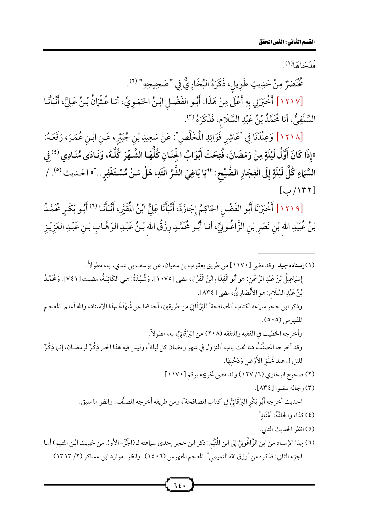إِسْمَاعِيلُ بْنُ عَبْدِ الرَّحْمَنِ: هو أَبُو الْفِدَاءِ ابْنُ الْفَرَّاءِ، مضى [١٠٧٥]. وَشُهْدَةُ: هي الكَاتِبَةُ، مضت [٧٤١]. وَمُحَمَّدُ بْنُ عَبْدِ السَّلَامِ: هو الأَنْصَارِيُّ، مضى [٨٣٤].