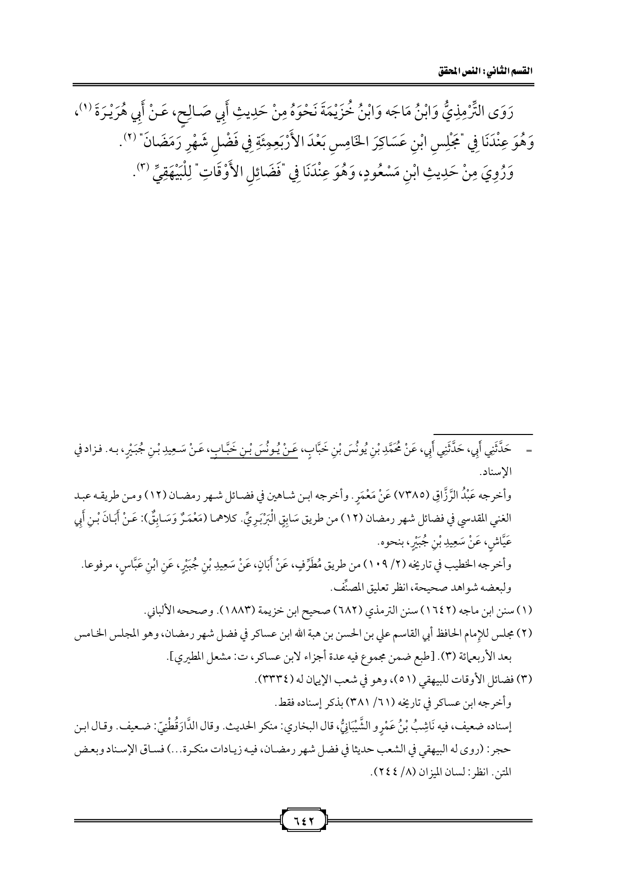 رَوَى التِّرْمِذِيُّ وَابْنُ مَاجَه وَابْنُ خُزَيْمَةَ نَحْوَهُ مِنْ حَدِيثِ أَبِي صَالِحٍ، عَنْ أَبِي هُرَيْرَةَ (¬١)، وَهُوَ عِنْدَنَا فِي "مَجْلِسِ ابْنِ عَسَاكِرَ الخَامِسِ بَعْدَ الأَرْبَعِمِئَةِ فِي فَضْلِ شَهْرِ رَمَضَانَ" (¬٢).