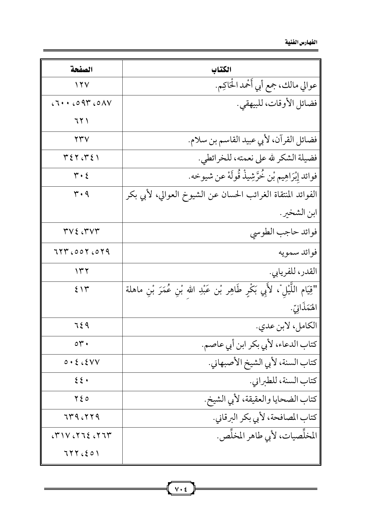 الكتاب الصفحة عوالي مالك، جمع أبي أَحْمد الْحَاكِم ١٢٧ فضائل الأوقات، للبيهقي ٥٨٧، ٥٩٣، ٦٠٠، ٦٢١ فضائل القرآن، لأبي عبيد القاسم بن سلام ٢٣٧ فضيلة الشكر لله على نعمته، للخرائطي ٣٤١، ٣٤٢ فوائد إِبْرَاهِيم بْن خُرَّشِيذْ قُولَهْ عن شيوخه ٣٠٤ الفوائد المنتقاة الغرائب الحسان عن الشيوخ العوالي، لأبي بكر ابن الشخير ٣٠٩ فوائد حاجب الطوسي ٣٧٣، ٣٧٤ فوائد سمويه ٥٢٩، ٥٥٢، ٦٢٣ القدر، للفريابي ١٣٢ " قِيَام اللَّيْلِ"، لأَبِي بَكْرٍ طَاهِر بْن عَبْدِ اللهِ بْنِ عُمَرَ بْنِ ماهلة الهَمَذَانِيّ ٤١٣ الكامل، لابن عدي ٦٤٩ كتاب الدعاء، لأبي بكر ابن أبي عاصم ٥٣٠ كتاب السنة، لأبي الشيخ الأصبهاني ٤٧٧، ٥٠٤ كتاب السنة، للطبراني ٤٤٠ كتاب الضحايا والعقيقة، لأبي الشيخ ٢٤٥ كتاب المصافحة، لأبي بكر البرقاني ٢٢٩، ٦٣٩ المخلِّصيات، لأبي طاهر المخلِّص ٢٦٣، ٢٦٤، ٣١٧، ٤٥١، ٦٢٢