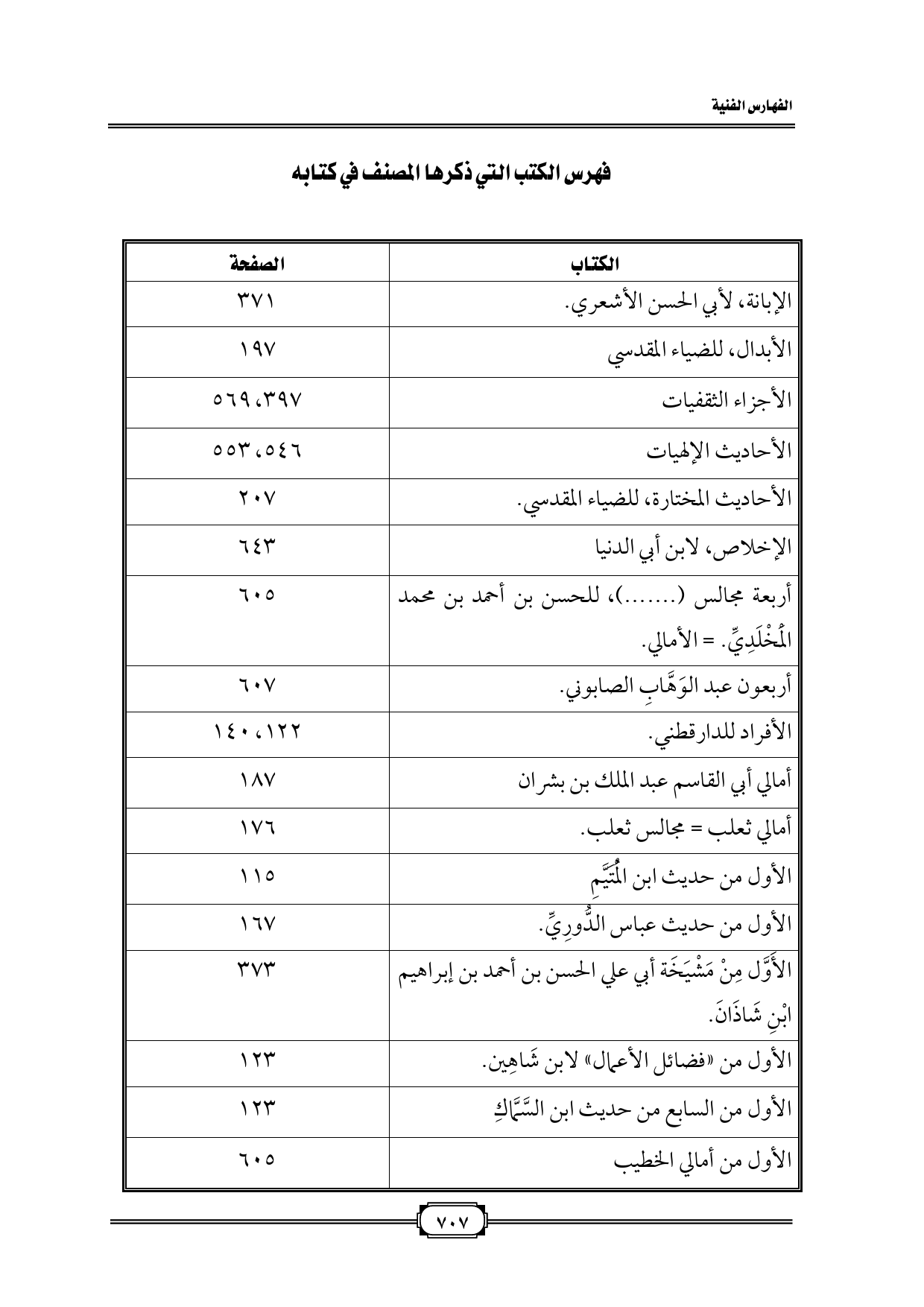 الكتاب الصفحة الإبانة، لأبي الحسن الأشعري ٣٧١ الأبدال، للضياء المقدسي ١٩٧ الأجزاء الثقفيات ٣٩٧، ٥٦٩ الأحاديث الإلهيات ٥٤٦، ٥٥٣ الأحاديث المختارة، للضياء المقدسي ٢٠٧ الإخلاص، لابن أبي الدنيا ٦٤٣ أربعة مجالس (. . . . . .)، للحسن بن أحمد بن محمد الْمَخْلَدِيِّ = الأمالي ٦٠٥ أربعون عبد الوَهَّابِ الصابوني ٦٠٧ الأفراد للدارقطني ١٢٢، ١٤٠ أمالي أبي القاسم عبد الملك بن بشران ١٨٧ أمالي ثعلب = مجالس ثعلب ١٧٦ الأول من حديث ابن الْمُتَيَّمِ ١١٥ الأول من حديث عباس الدُّورِيِّ ١٦٧ الأَوَّل مِنْ مَشْيَخَة أبي علي الحسن بن أحمد بن إبراهيم ابْنِ شَاذَانَ ٣٧٣ الأول من «فضائل الأعمال» لابن شَاهِين ١٢٣ الأول من السابع من حديث ابن السَّمَّاكِ ١٢٣ الأول من أمالي الخطيب ٦٠٥