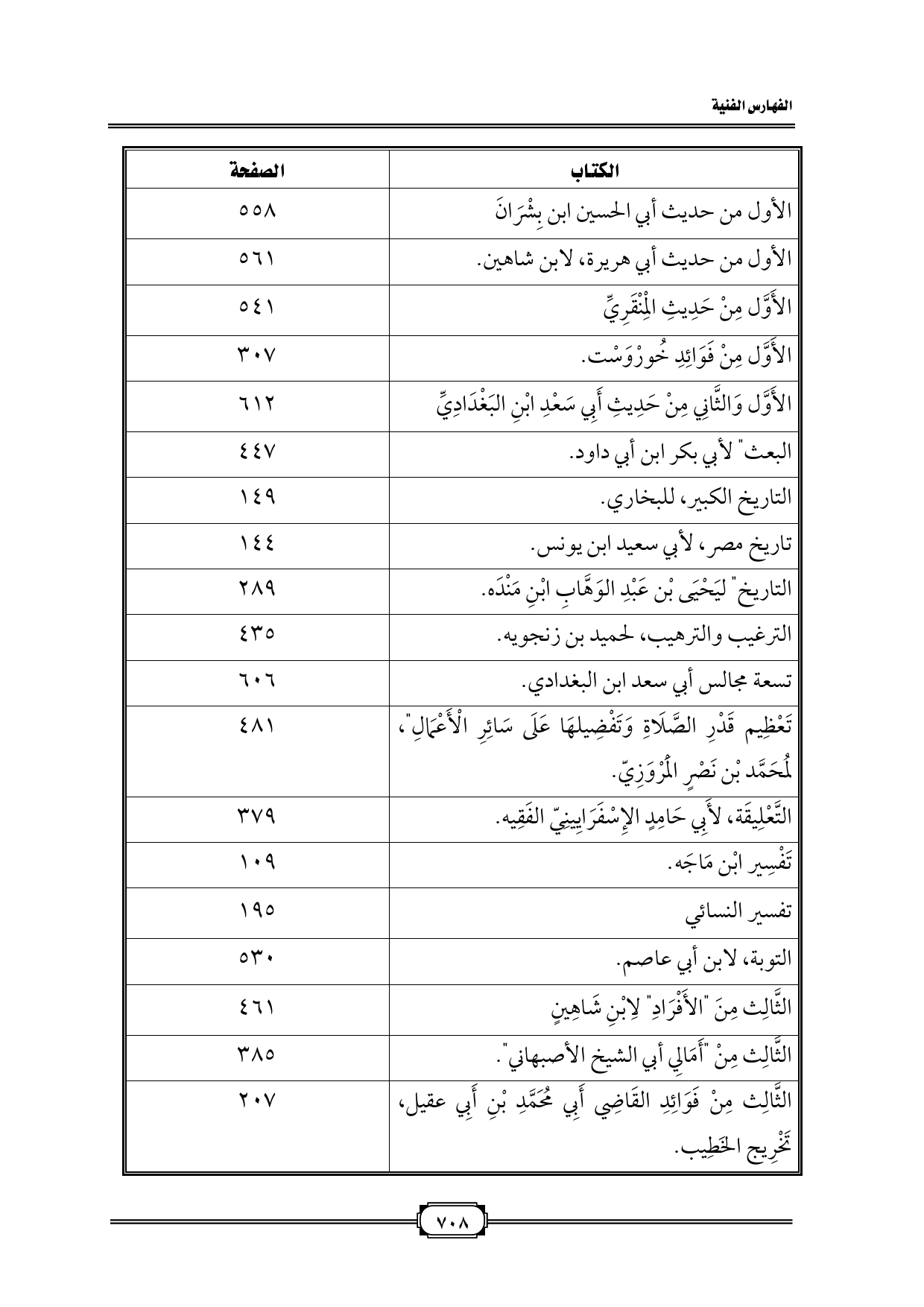 الكتاب الصفحة الأول من حديث أبي الحسين ابن بِشْرَانَ ٥٥٨ الأول من حديث أبي هريرة، لابن شاهين ٥٦١ الأَوَّل مِنْ حَدِيثِ الْمِنْقَرِيِّ ٥٤١ الأَوَّل مِنْ فَوَائِدِ خُورْوَسْت ٣٠٧ الأَوَّل وَالثَّانِي مِنْ حَدِيثِ أَبِي سَعْدِ ابْنِ البَغْدَادِيِّ ٦١٢ البعث" لأبي بكر ابن أبي داود ٤٤٧ التاريخ الكبير، للبخاري ١٤٩ تاريخ مصر، لأبي سعيد ابن يونس ١٤٤ التاريخ" ليَحْيَى بْن عَبْدِ الوَهَّابِ ابْنِ مَنْدَه ٢٨٩ الترغيب والترهيب، لحميد بن زنجويه ٤٣٥ تسعة مجالس أبي سعد ابن البغدادي ٦٠٦ تَعْظِيم قَدْرِ الصَّلَاةِ وَتَفْضِيلهَا عَلَى سَائِرِ الْأَعْمَالِ"، لمُحَمَّد بْن نَصْرٍ الْمَرْوَزِيّ ٤٨١ التَّعْلِيقَة، لأَبِي حَامِدٍ الإِسْفَرَايِينِيّ الفَقِيه ٣٧٩ تَفْسِير ابْن مَاجَه ١٠٩ تفسير النسائي ١٩٥ التوبة، لابن أبي عاصم ٥٣٠ الثَّالِث مِنَ "الأَفْرَادِ" لِابْنِ شَاهِينٍ ٤٦١ الثَّالِث مِنْ "أَمَالِي أبي الشيخ الأصبهاني" ٣٨٥ الثَّالِث مِنْ فَوَائِدِ القَاضِي أَبِي مُحَمَّدِ بْنِ أَبِي عقيل، تَخْرِيج الخَطِيب ٢٠٧