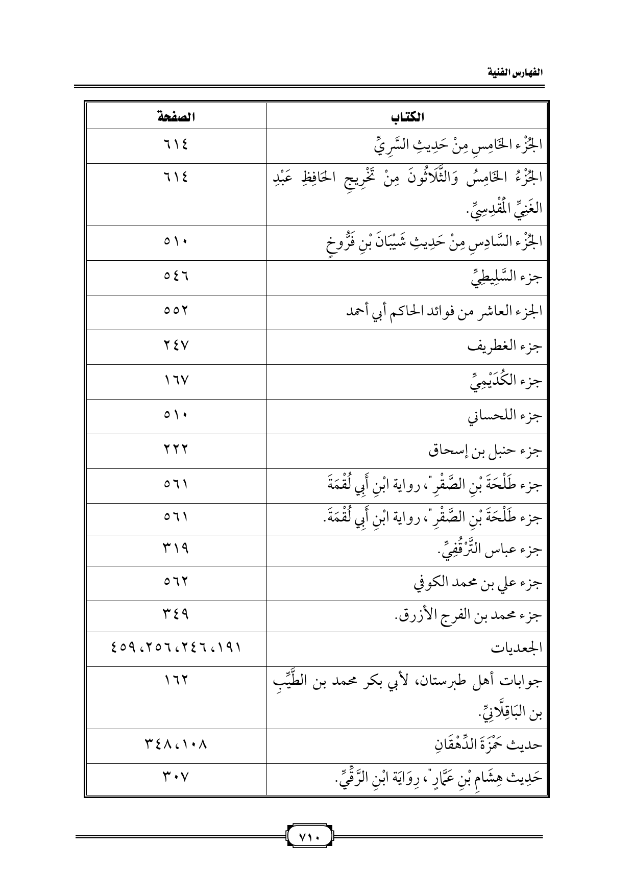 الكتاب الصفحة الجُزْء الخَامِسِ مِنْ حَدِيثِ السَّرِيِّ ٦١٤ الجُزْءُ الخَامِسُ وَالثَّلَاثُونَ مِنْ تَخْرِيجِ الحَافِظِ عَبْدِ الغَنِيِّ الْمَقْدِسِيِّ ٦١٤ الجُزْء السَّادِسِ مِنْ حَدِيثِ شَيْبَانَ بْنِ فَرُّوخٍ ٥١٠ جزء السَّلِيطِيِّ ٥٤٦ الجزء العاشر من فوائد الحاكم أبي أحمد ٥٥٢ جزء الغطريف ٢٤٧ جزء الكُدَيْمِيِّ ١٦٧ جزء اللحساني ٥١٠ جزء حنبل بن إسحاق ٢٢٢ جزء طَلْحَةَ بْنِ الصَّقْرِ"، رواية ابْنِ أَبِي لُقْمَةَ ٥٦١ جزء طَلْحَةَ بْنِ الصَّقْرِ"، رواية ابْنِ أَبِي لُقْمَةَ ٥٦١ جزء عباس التَّرْقُفِيِّ ٣١٩ جزء علي بن محمد الكوفي ٥٦٢ جزء محمد بن الفرج الأزرق ٣٤٩ الجعديات ١٩١، ٢٤٦، ٢٥٦، ٤٥٩ جوابات أهل طبرستان، لأبي بكر محمد بن الطَّيِّبِ بن البَاقِلَّانِيِّ ١٦٢ حديث حَمْزَةَ الدِّهْقَانِ ١٠٨، ٣٤٨ حَدِيث هِشَامِ بْنِ عَمَّارٍ"، رِوَايَة ابْنِ الرَّقِّيِّ ٣٠٧