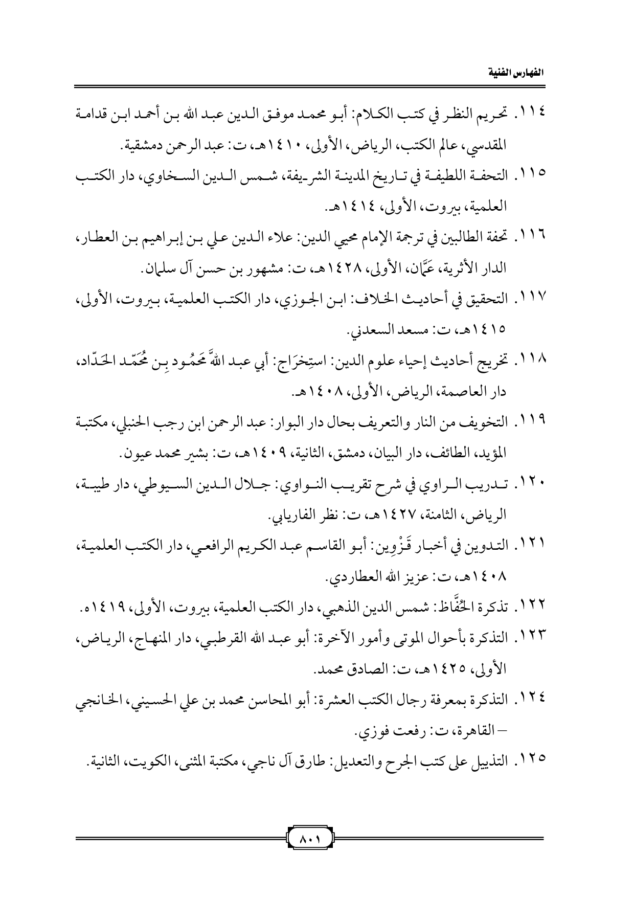 ١١٤. تحريم النظر في كتب الكلام: أبو محمد موفق الدين عبد الله بن أحمد ابن قدامة المقدسي، عالم الكتب، الرياض، الأولى، ١٤١٠ هـ، ت: عبد الرحمن دمشقية.