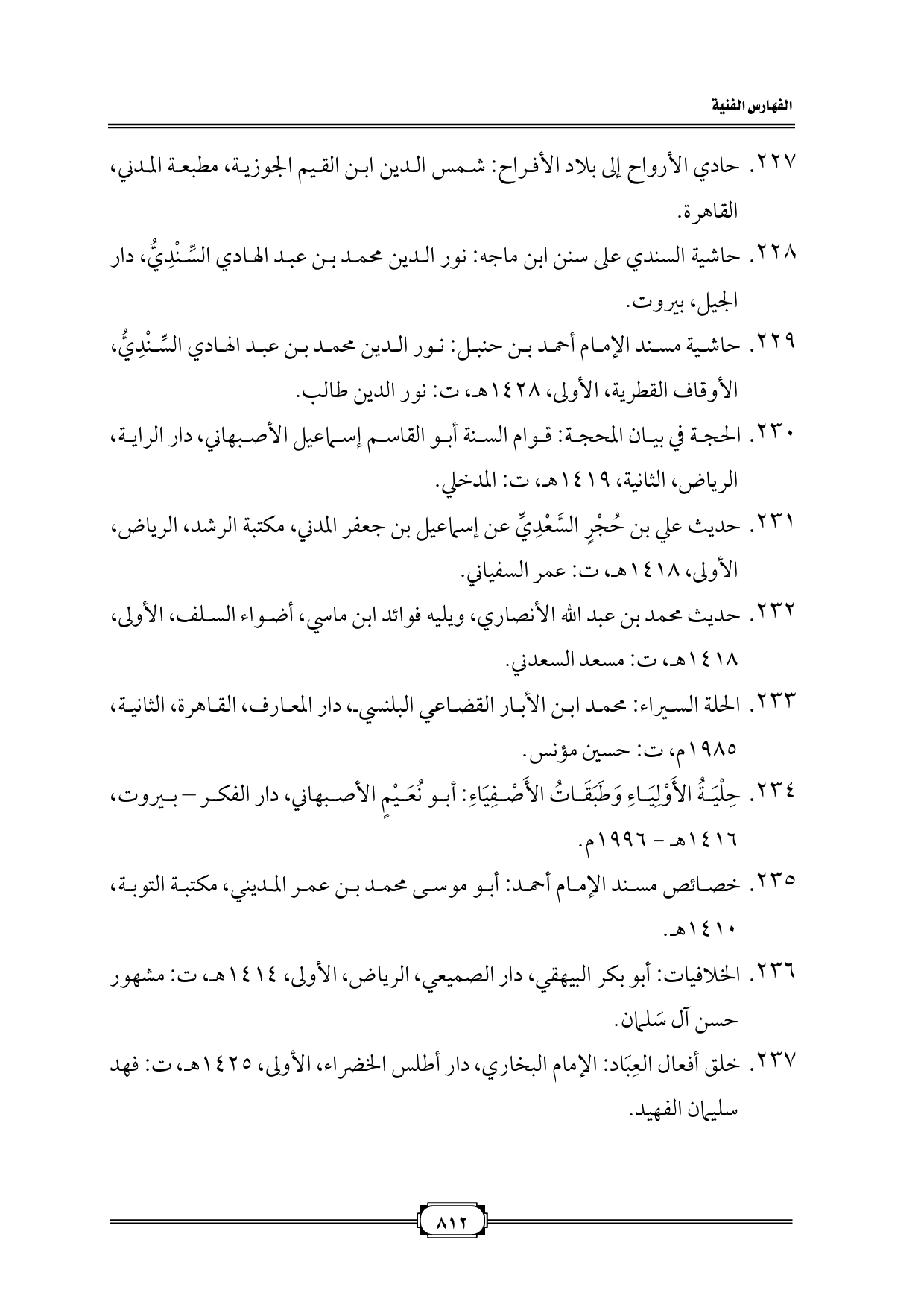 ٢٢٩. حاشية مسند الإمام أحمد بن حنبل: نور الدين محمد بن عبد الهادي السِّنْدِيُّ، الأوقاف القطرية، الأولى، ١٤٢٨ هـ، ت: نور الدين طالب.
