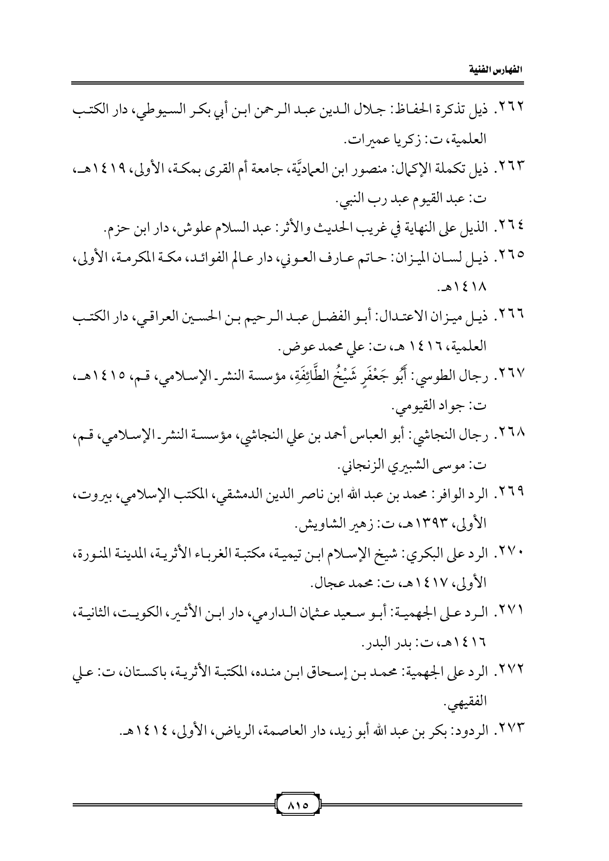 ٢٦٥. ذيل لسان الميزان: حاتم عارف العوني، دار عالم الفوائد، مكة المكرمة، الأولى، ١٤١٨ هـ.