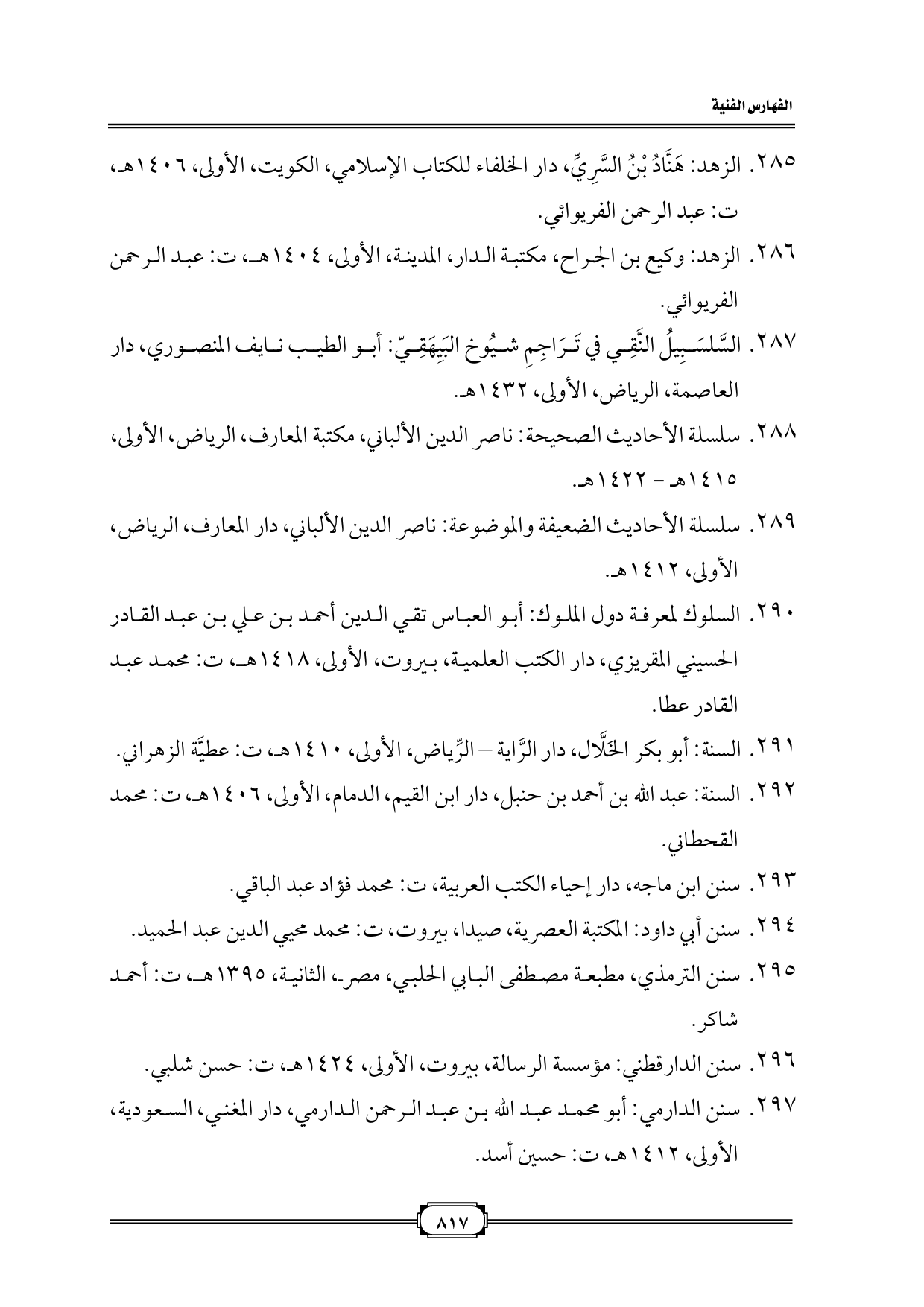 ٢٨٥. الزهد: هَنَّادُ بْنُ السَّرِيِّ، دار الخلفاء للكتاب الإسلامي، الكويت، الأولى، ١٤٠٦ هـ، ت: عبد الرحمن الفريوائي.