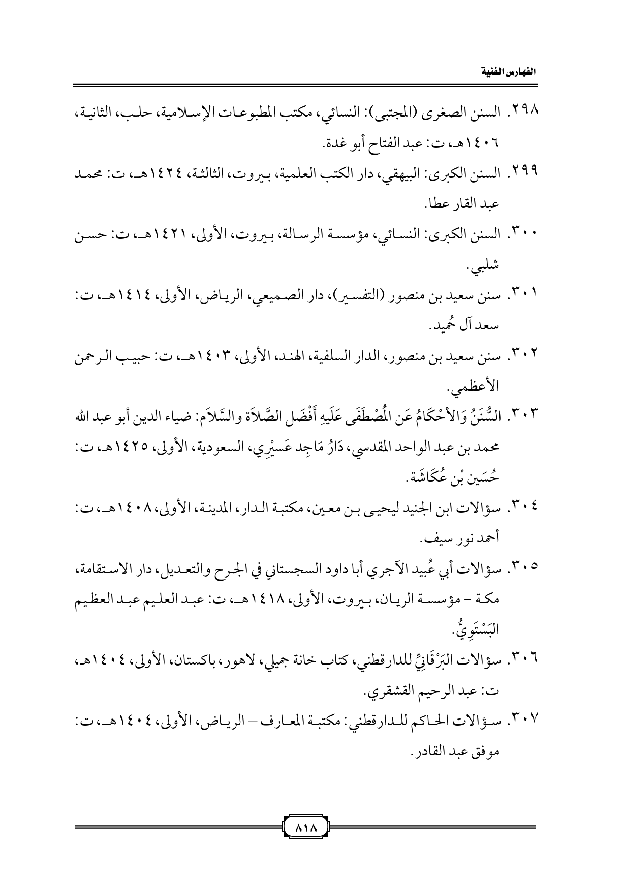 ٢٩٨. السنن الصغرى (المجتبى): النسائي، مكتب المطبوعات الإسلامية، حلب، الثانية، ١٤٠٦ هـ، ت: عبد الفتاح أبو غدة.