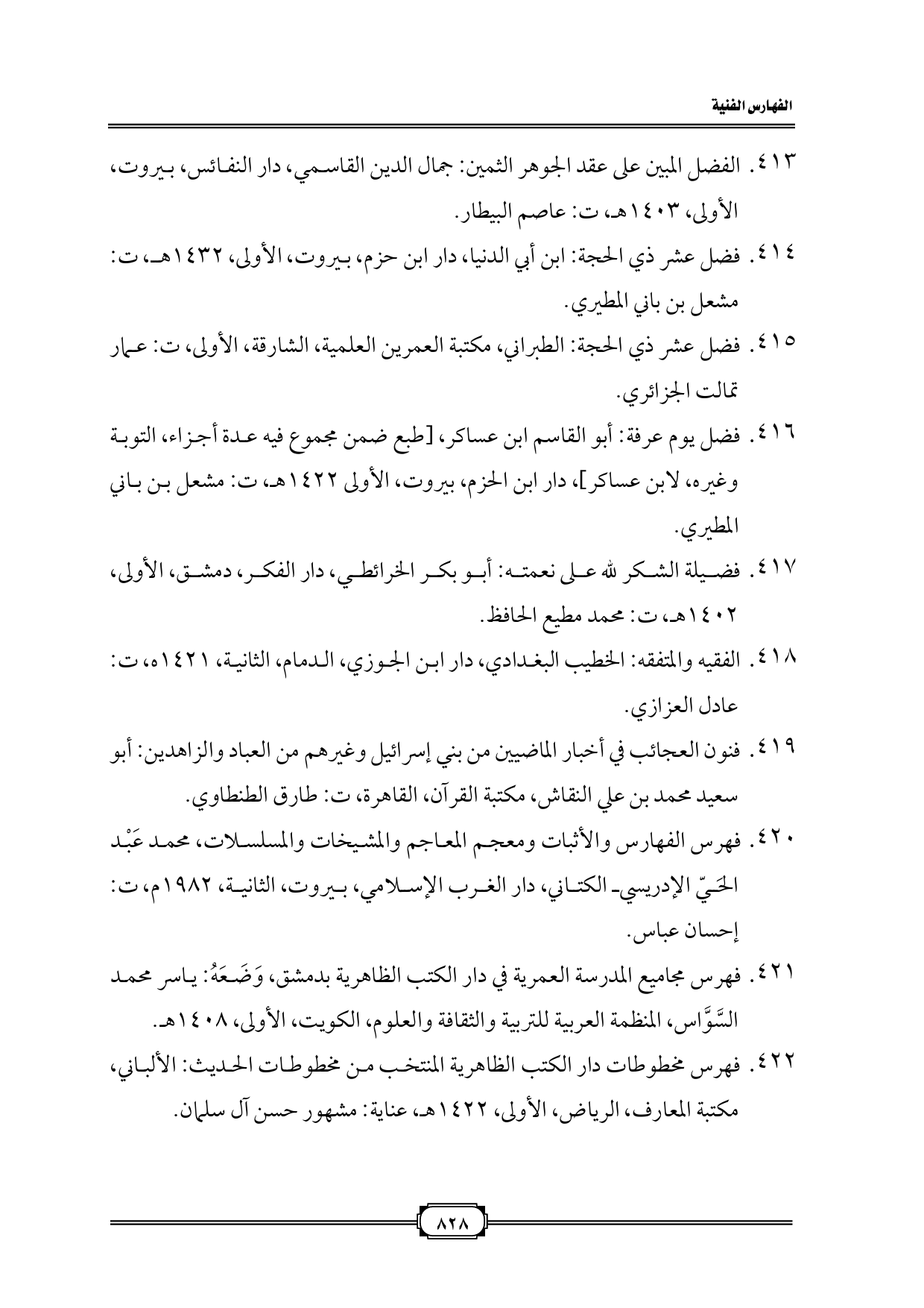 ٤٢١. فهرس مجاميع المدرسة العمرية في دار الكتب الظاهرية بدمشق، وَضَعَهُ: ياسر محمد السَّوَّاس، المنظمة العربية للتربية والثقافة والعلوم، الكويت، الأولى، ١٤٠٨ هـ.