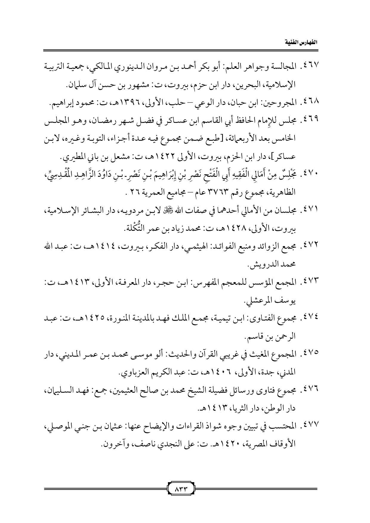 ٤٦٧. المجالسة وجواهر العلم: أبو بكر أحمد بن مروان الدينوري المالكي، جمعية التربية الإسلامية، البحرين، دار ابن حزم، بيروت، ت: مشهور بن حسن آل سلمان.