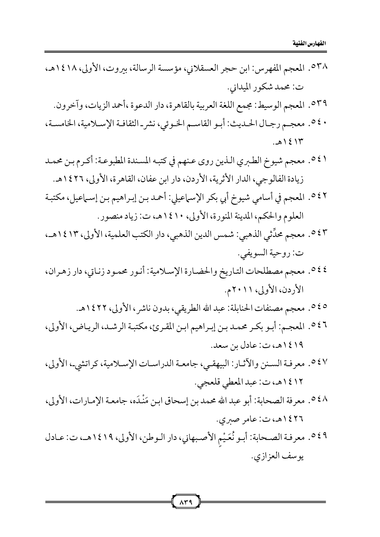 ٥٣٨. المعجم المفهرس: ابن حجر العسقلاني، مؤسسة الرسالة، بيروت، الأولى، ١٤١٨ هـ، ت: محمد شكور الميداني.