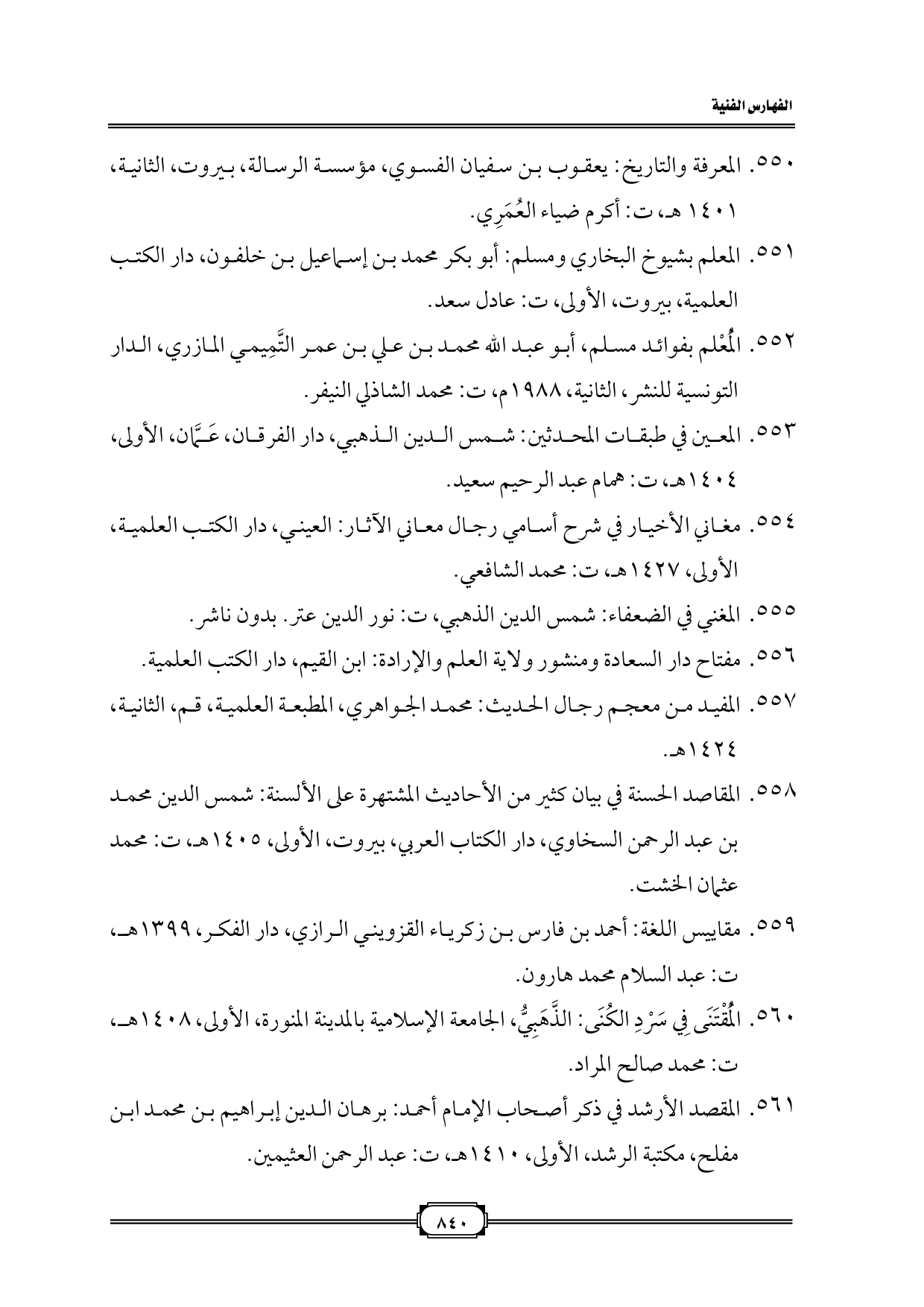 ٥٥١. المعلم بشيوخ البخاري ومسلم: أبو بكر محمد بن إسماعيل بن خلفون، دار الكتب العلمية، بيروت، الأولى، ت: عادل سعد.