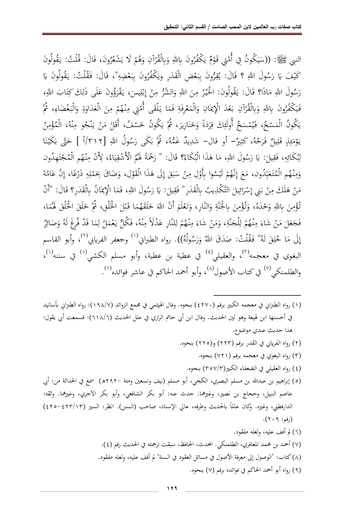 النبي - صلى الله عليه وسلم -: "سَيَكُونُ فِي أمَّتِي قَوْمٌ يَكْفُرُونَ بِاللِّهِ وَبِالْقُرْآنِ وَهُمْ لَا يَشْعُرُونَ، قَالَ: قُلْتُ: يَقُولُونَ كَيْفَ يَا رَسُولَ اللَّهِ؟ قَالَ: يُقِرُّونَ بِبَعْضِ الْقَدَرِ ويَكْفُرُونَ بِبَعْضِهِ"، قَالَ: فَقُلْتُ: يَقُولُونَ يَا رَسُولَ اللَّهِ مَاذَا؟ قَالَ: يَقُولُونَ: الخَيْرُ مِنَ اللَّهِ وَالشَّرُّ مِنْ إِبْلِيسَ، يَقْرَؤُونَ عَلَى ذَلِكَ كِتَابَ اللَّهِ، فَيَكْفرُونَ بِاللَّهِ وَبِالْقُرْآنِ بَعْدَ الْإِيمَانِ وَالْمَعْرِفَةِ فَمَا يَلْقَى أمَّتِي مِنْهُمْ مِنَ الْعَدَاوَةِ وَالْبَغْضَاءِ، ثُمَّ يَكُونُ الْمَسْخ، فَيُمْسَخُ أُولَئِكَ قِرَدَةً وَخَنَازِيرَ، ثُمَّ يَكُونُ خَسْف، أَقَلَّ مَنْ يَنْجُو مِنْه، الْمُؤْمِنُ يَوْمَئِذٍ قَلِيلٌ فَرَحُهُ، كَثِيرٌ - أو قال - شَدِيدٌ غَمُّه، ثُمَّ بَكَى رَسولُ اللَّهِ حَتَّى بَكَيْنَا لِبُكَائِهِ، فَقِيلَ: يَا رَسولَ اللَّهِ، مَا هَذَا الْبُكَاءُ؟ قَالَ: "رَحْمَةً لَهُم الْأَشْقِيَاء، لِأَنّ مِنْهُم الْمُجْتَهِدُون وَمِنْهُم الْمُتَعَبِّدُون، مَعَ إِنَّهُمْ لَيْسُوا بِأَوَّلِ مِنْ سَبَقَ إِلَى هَذَا الْقَوْلِ، وَضَاقَ بحمْلِهِ ذَرْعًا، إِنَّ عَامَّةَ مَنْ هَلَكَ مِنْ بَنِي إِسْرَائِيلَ التَّكْذِيبُ بِالْقَدَرِ" فَقِيلَ: يَا رَسُولَ اللَّهِ، فَمَا الْإِيمَان بِالْقَدَرِ؟ قَالَ: "أَنْ تؤْمِنَ بِاللَّهِ وَحْدَهُ، وَتُؤْمِنَ بِالجنَّةِ وَالنَّارِ، وَتَعْلَمَ أَنَّ اللَّهَ خَلَقَهُمَا قَبْلَ الخلْقِ، ثُمَّ خَلَقَ الخلْقَ لَهُمَا، فَجَعَلَ مَنْ شَاءَ مِنْهُمْ لِلْجَنَّةِ، وَمَنْ شَاءَ مِنْهُمْ لِلنَّارِ عَدْلًا مِنْه، فَكُلٌّ يَعْمَلُ لِمَا قَدْ فُرِغ لَهُ وَصَائِرٌ إِلَى مَا خلِقَ لَهُ "فَقلْتُ: صَدَقَ اللهُ وَرَسولُهُ". رواه الطبراني (¬١) وجعفر الفريابي (¬٢)، وأبو القاسم البغوي في معجمه (¬٣)، والعقيلي (¬٤) في عطية بن عطية، وأبو مسلم الكشي (¬٥) في سننه (¬٦)، والطلمنكي (¬٧) في كتاب الأصول (¬٨)، وأبو أحمد الحاكم في عاشر فوائده (¬٩).
