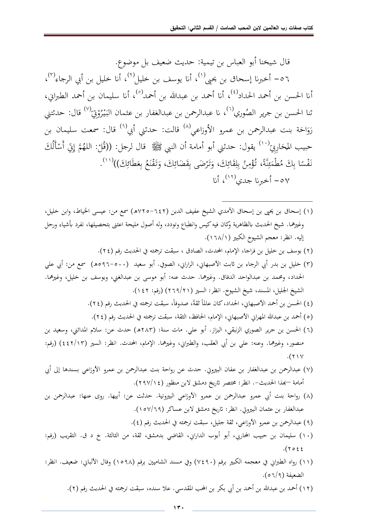 ٥٦ - أخبرنا إسحاق بن يحيى (¬١)، أنا يوسف بن خليل (¬٢)، أنا خليل بن أبي الرجاء (¬٣)، أنا الحسن بن أحمد الحداد (¬٤)، أنا أحمد بن عبد الله بن أحمد (¬٥)، أنا سليمان بن أحمد الطبراني، ثنا الحسن بن جرير الصُوري (¬٦)، نا عبد الرحمن بن عبد الغفار بن عثمان البَيْرُوْتيّ (¬٧) قال: حدثتني رَوَاحَة بنت عبد الرحمن بن عمرو الأوزاعي (¬٨) قالت: حدثني أبى (¬٩) قال: سمعت سليمان بن حبيب المحَاربيّ (¬١٠) يقول: حدثني أبو أمامة أن النبي - صلى الله عليه وسلم - قال لرجل: "قُلْ: اللهُمَّ إني أَسْأَلُكَ نَفْسًا بِكَ مُطْمَئِنَّةً، تُؤْمِنُ بِلِقَائِكَ، وَتَرْضَى بِقضَائِكَ، وَتَمنَعُ بِعَطَائِكَ" (¬١١).