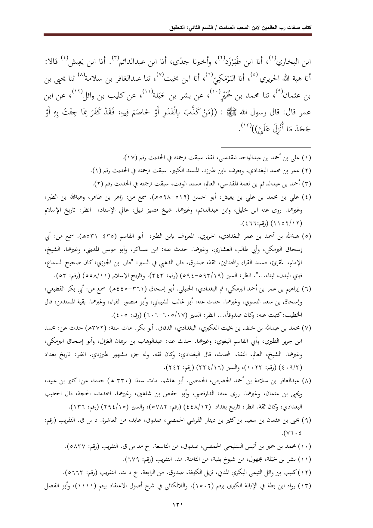 ابن البخاري (¬١)، أنا ابن طَبَرْزَد (¬٢)، وأخبرنا جدّي، أنا ابن عبد الدائم (¬٣). أنا ابن يَعِيش (¬٤) قالا: أنا هبة الله الحريري (¬٥)، أنا البَرْمَكِيّ (¬٦)، أنا ابن بخيت (¬٧)، ثنا عبد الغافر بن سلامة (¬٨) ثنا يحيى بن بن عثمان (¬٩)، ثنا محمد بن حُمَيْرٍ (¬١٠)، عن بشر بن جَبَلة (¬١١)، عن كليب بن وائل (¬١٢)، عن ابن عمر قال: قال رسول الله - صلى الله عليه وسلم -: "مَنْ كَذَّبَ بِالْقَدَرِ أَوْ خَاصَمَ فِيهِ، فَقَدْ كَفَرَ بِمَا جِئْتُ بِهِ أَوْ جَحَدَ مَا أُنْزِلَ عَلَيَّ" (¬١٣).