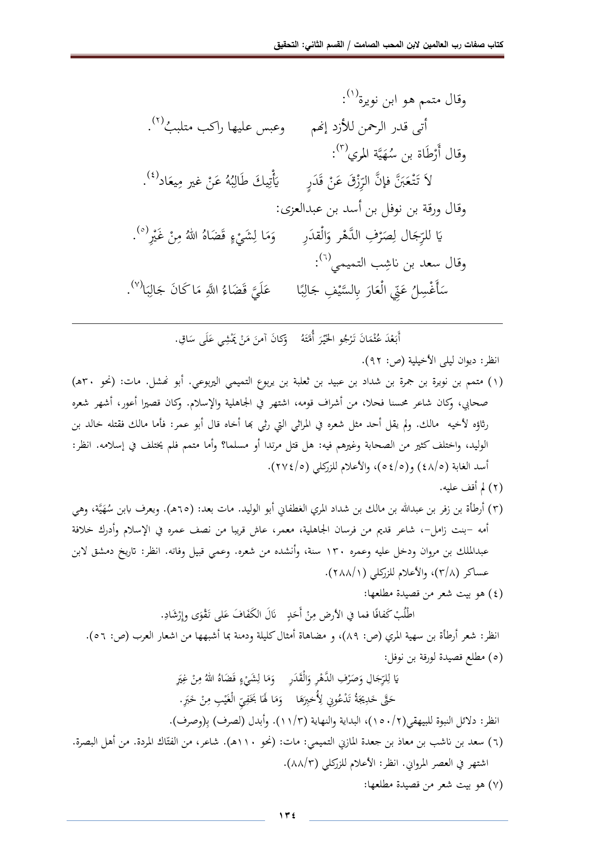 (¬١) متمم بن نويرة بن جمرة بن شداد بن عبيد بن ثعلبة بن يربوع التميمي اليربوعي. أبو نهشل. مات: (نحو ٣٠ هـ) صحابي، وكان شاعر محسنا فحلا، من أشراف قومه، اشتهر في الجاهلية والإسلام. وكان قصيرا أعور، أشهر شعره رثاؤه لأخيه مالك. ولم يقل أحد مثل شعره في المراثي التي رثي بها أخاه قال أبو عمر: فأما مالك فقتله خالد بن الوليد، واختلف كثير من الصحابة وغيرهم فيه: هلال قتل مرتدا أو مسلما؟ وأما متمم فلم يختلف في إسلامه. انظر: أسد الغابة (٥/ ٤٨) و (٥/ ٥٤)، والأعلام للزكلي (٥/ ٢٧٤).