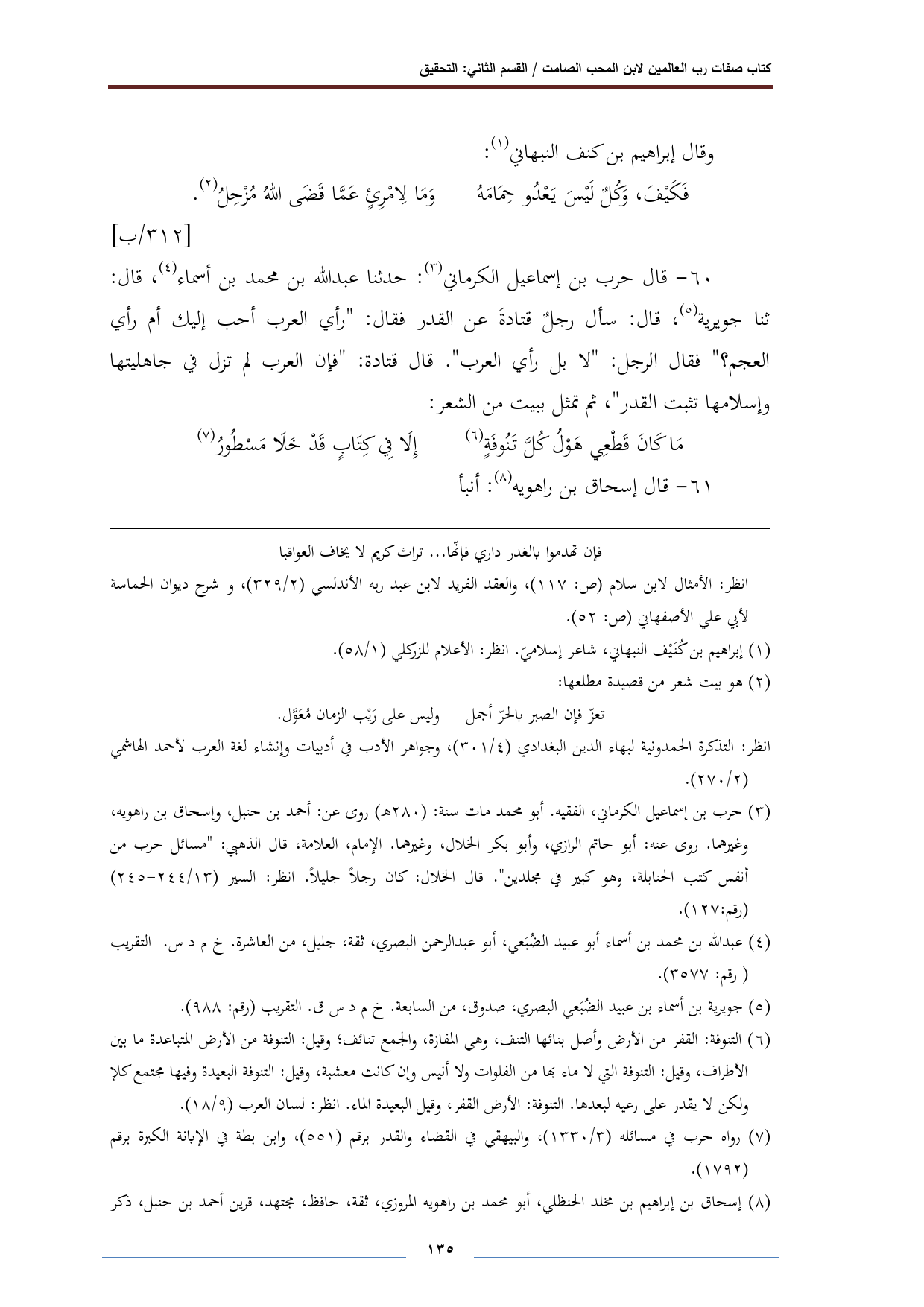 (¬٣) حرب بن إسماعيل الكرماني، الفقيه. أبو "محمد مات سنة: (٢٨٠ هـ) روى عن: أحمد بن حنبل، وإسحاق بن راهويه، وغيرهما. روى عنه: أبو حاتم الرازي، وأبو بكر الخلال، وغيرهما. الإمام، العلامة، قال الذهبي: "مسائل حرب من أنفس كتب الحنابلة، وهو كبير في مجلدين". قال الخلال: كان رجلًا جليلًا. انظر: السير (١٣/ ٢٤٤ - ٢٤٥) (رقم:١٢٧).