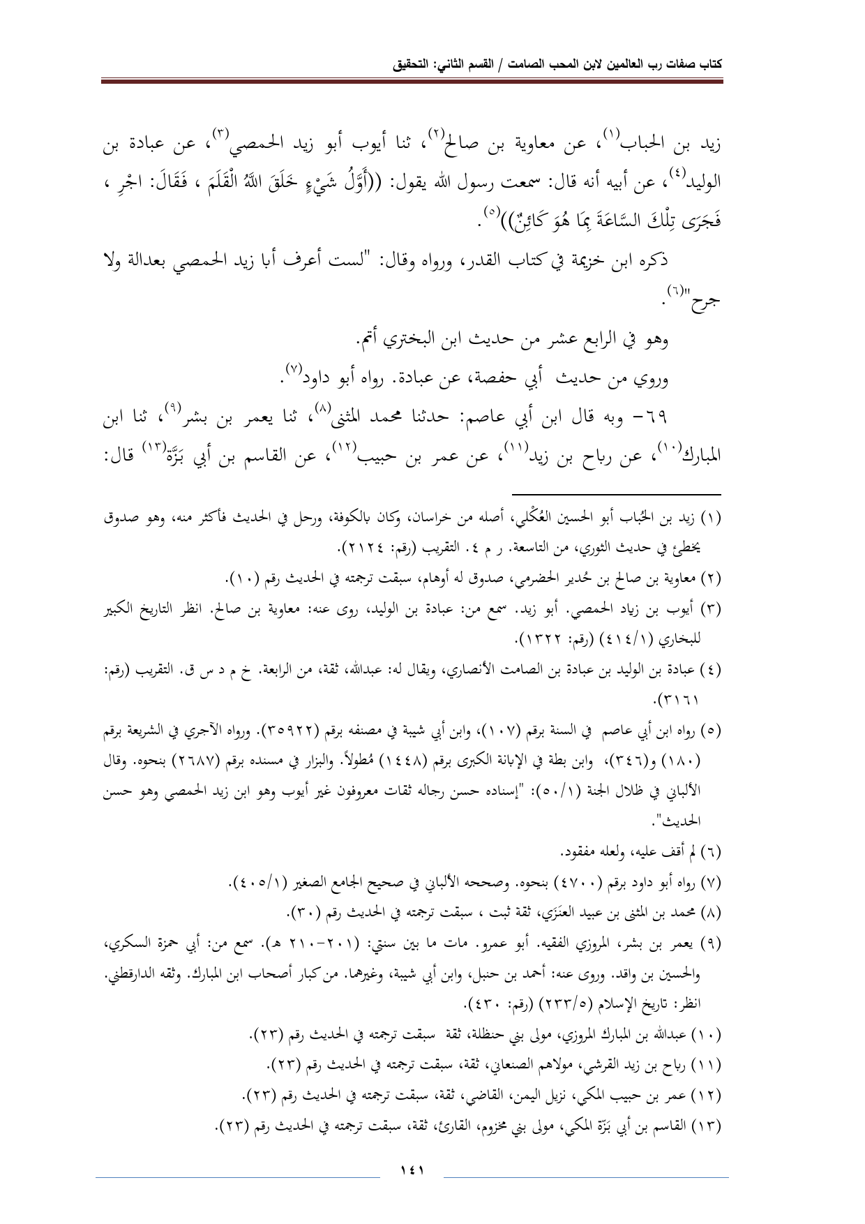 (¬٥) رواه ابن أبي عاصم في السنة برقم (١٠٧)، وابن أبي شيبة في مصنفه برقم (٣٥٩٢٢). ورواه الآجري في الشريعة برقم (١٨٠) و (٣٤٦)، وابن بطة في الإبانة الكبرى برقم (١٤٤٨) مُطولًا. والبزار في مسنده برقم (٢٦٨٧) بنحوه. وقال الألباني في ظلال الجنة (١/ ٥٠): "إسناده حسن رجاله ثقات معروفون غير أيوب وهو ابن زيد الحمصي وهو حسن الحديث".