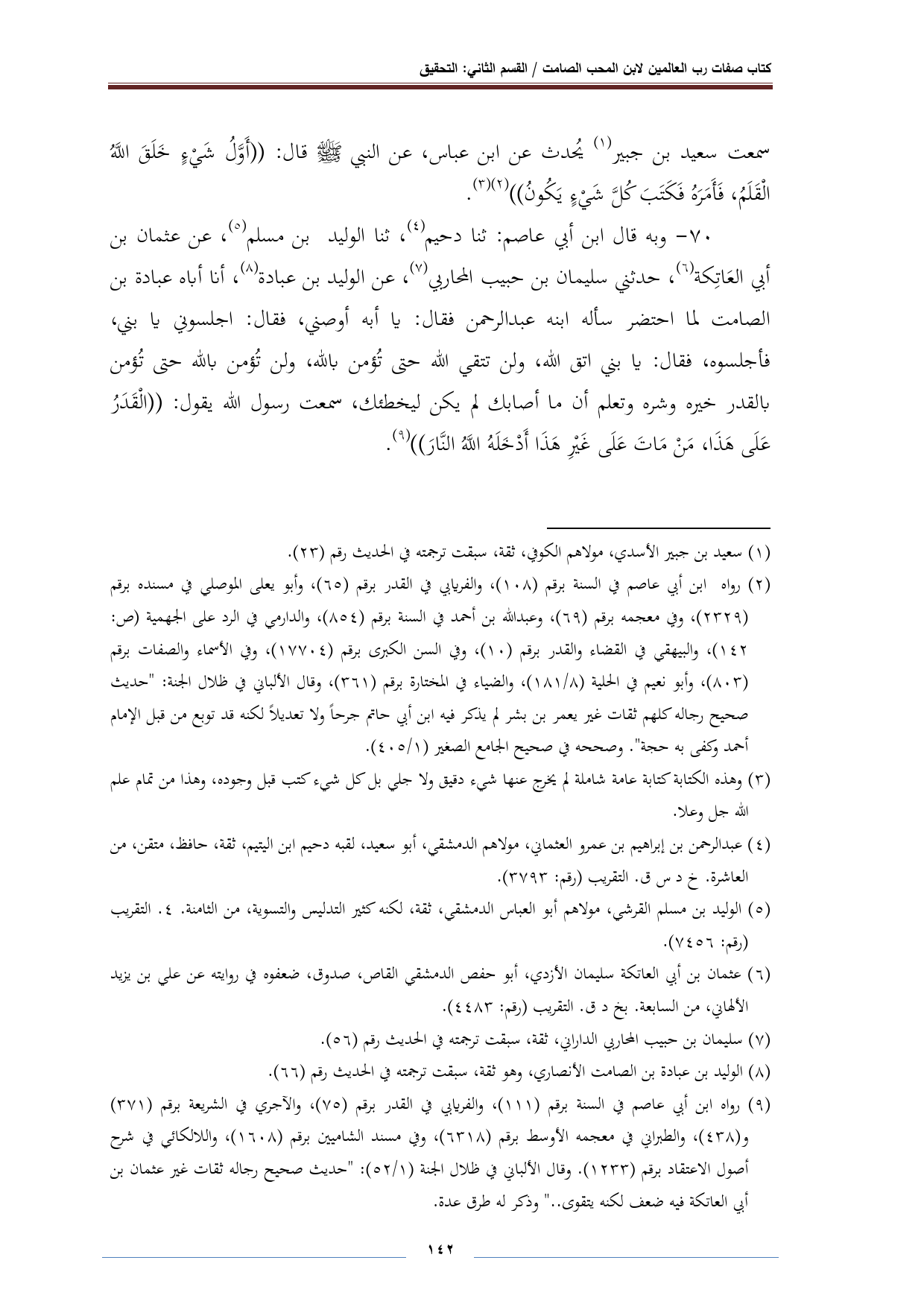 (¬٩) رواه ابن أبي عاصم في السنة برقم (١١١)، والفريابي في القدر برقم (٧٥)، والآجري في الشريعة برقم (٣٧١) و (٤٣٨)، والطبراني في معجمه الأوسط برقم (٦٣١٨)، وفي مسند الشاميين برقم (١٦٠٨)، واللالكائي في شرح أصول الاعتقاد برقم (١١٣٣). وقال الألباني في ظلال الجنة (١/ ٥٢): "حديث صحيح رجاله ثقات غير عثمان بن أبي العاتكة فيه ضعف لكنه يتقوى .. " وذكر له طرق عدة.