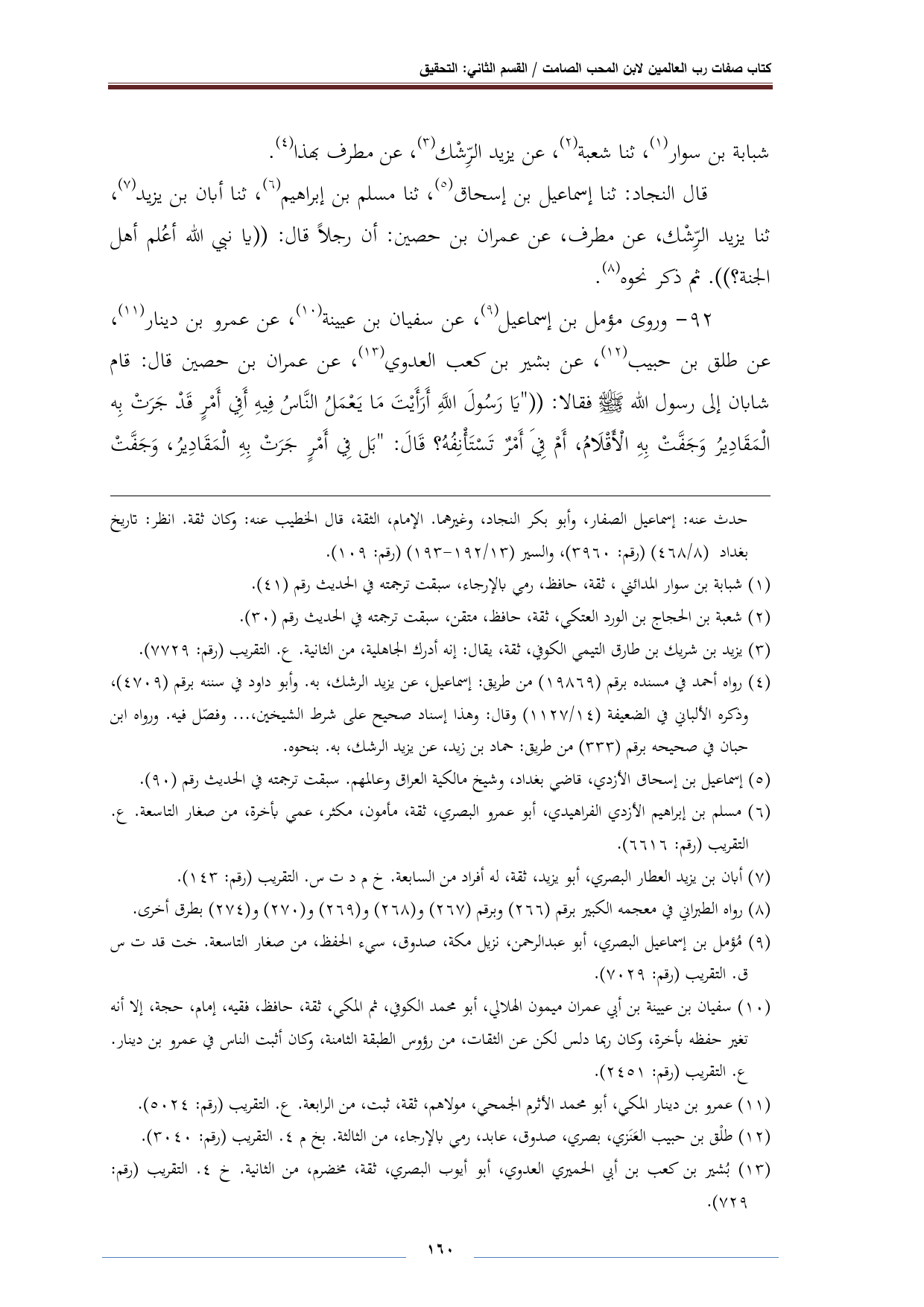 قال النجاد: ثنا إسماعيل بن إسحاق (¬٥)، ثنا مسلم بن إبراهيم (¬٦)، ثنا أبان بن يزيد (¬٧)، ثنا يزيد الرِّشْك، عن مطرف، عن عمران بن حصين: أن رجلًا قال: "يا نبي الله أعُلم أهل الجنة؟ ". ثم ذكر نحوه (¬٨).