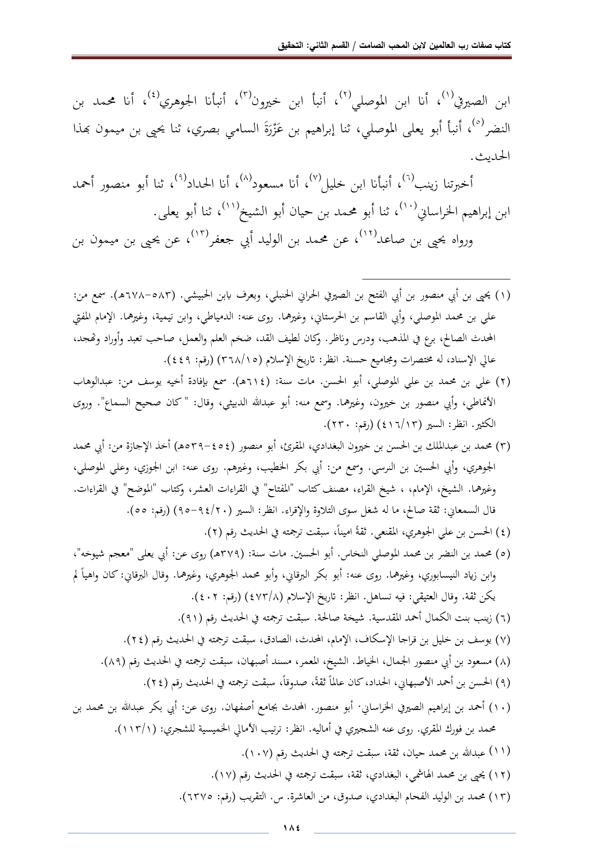 (¬١) يحيى بن أبي منصور بن أبي الفتح بن الصيرفي الحراني الحنبلي، ويعرف بابن الحبيشي. (٥٨٣ - ٦٧٨ هـ). سمع من: علي بن محمد الموصلي، وأبي القاسم بن الحرستاني، وغيرهما. روى عنه: الدمياطي، وابن تيمية، وغيرهما. الإمام المفتي المحدث الصالح، برع في المذهب، ودرس وناظر. وكان لطيف القد، ضخم العلم والعمل، صاحب تعبد وأوراد وتهجد، عالي الإسناد، له مختصرات ومجاميع حسنة. انظر: تاريخ الإسلام (١٥/ ٣٦٨) (رقم: ٤٤٩).