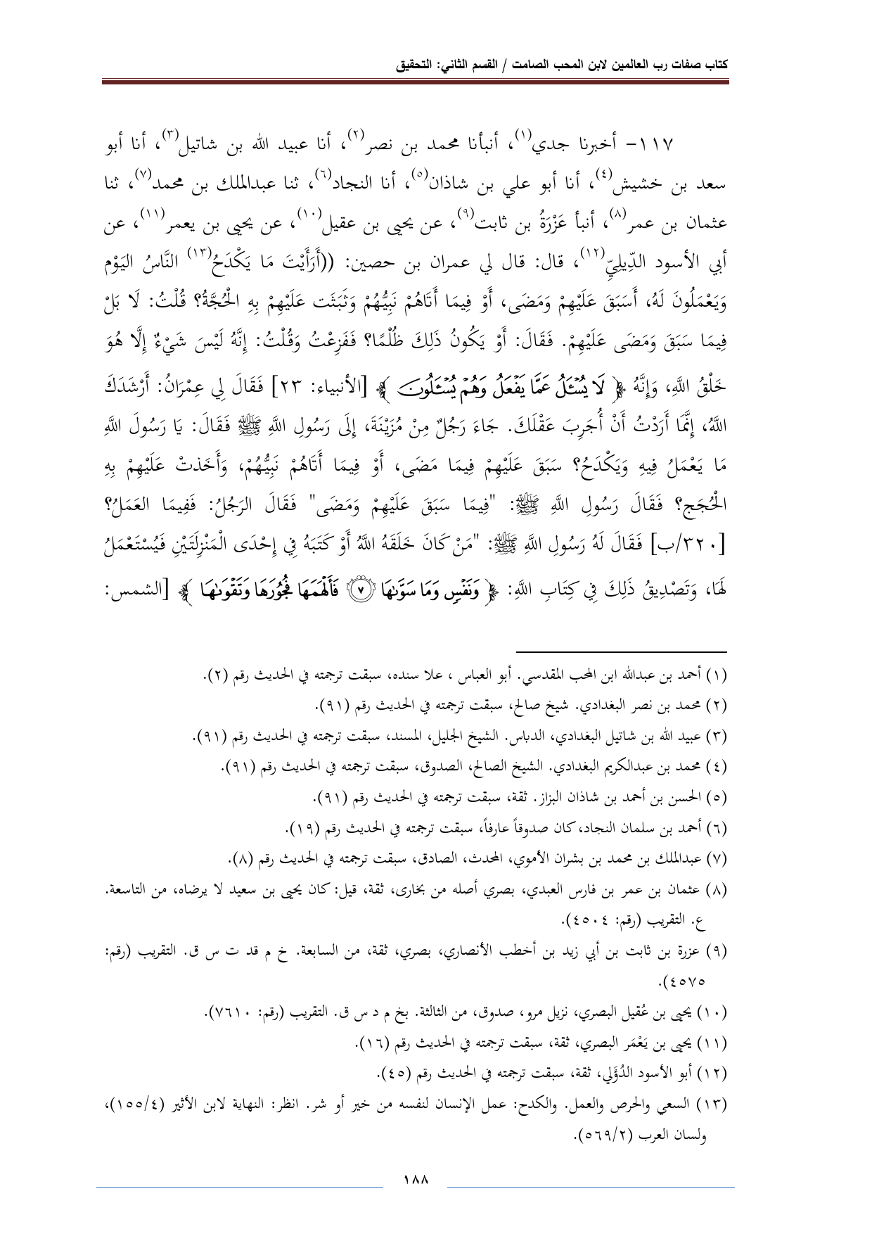 ١١٧ - أخبرنا جدي (¬١)، أنبأنا محمد بن نصر (¬٢)، أنا عبيد الله بن شاتيل (¬٣)، أنا أبو بن خشيش (¬٤)، أنا أبو على بن شاذان (¬٥)، أنا النجاد (¬٦)، ثنا عبد الملك بن محمد (¬٧)، ثنا عثمان بن عمر (¬٨)، أنبأ عَزْرَةُ بن ثابت (¬٩)، عن يحيى بن عقيل (¬١٠)، عن يحيى بن يعمر (¬١١)، عن أبي الأسود الدِّيلِيِّ (¬١٢)، قال: قال لي عمران بن حصين: "أَرَأَيْتَ مَا يَكْدَحُ (¬١٣) النَّاسُ اليَوْم وَيَعْمَلُونَ لَه، أَسَبَقَ عَلَيْهِمْ وَمَضَى، أَوْ فِيمَا أَتَاهُمْ نَبِيُّهُمْ وَثَبَتَت عَلَيْهِمْ بِهِ الحجَّةُ؟ قُلْتُ: لَا بَلْ فِيمَا سَبَقَ وَمَضَى عَلَيْهِمْ. فَقَالَ: أَوْ يَكُونُ ذَلِكَ ظُلْمًا؟ فَفَزِعْتُ وَقُلْتُ: إِنَّهُ لَيْسَ شَيْءٌ إِلَّا هُوَ خَلْقُ اللِّهِ، وَإنَّه {لَا يُسْأَلُ عَمَّا يَفْعَلُ} [الأنبياء: ٢٣] فَقَالَ لِي عِمْرَانُ: أَرْشَدَكَ الله، إِنَّمَا أَرَدْتُ أَنْ أُجَرِبَ عَقْلَكَ. جَاءَ رَجُلٌ مِنْ مُزَيْنَةَ، إِلَى رَسُولِ اللَّهِ - صلى الله عليه وسلم - فَقَالَ: يَا رَسُولَ اللهِ مَا يَعْمَلُ فِيهِ وَيَكْدَحُ؟ سَبَقَ عَلَيْهِمْ فِيمَا مَضَى، أَوْ فِيمَا أَتَاهُمْ نَبِيُّهُمْ، وَأَخَذتْ عَلَيْهِمْ بِهِ الْحُجَج؟ فَقَالَ رَسُولِ اللَّهِ - صلى الله عليه وسلم -: "فِيمَا سَبَقَ عَلَيْهِمْ وَمَضَى" فَقَالَ الرَجُل: فَفِيمَا العَمَلُ؟ فَقَالَ لَهُ رَسُولِ اللَّهِ - صلى الله عليه وسلم -: "مَنْ كَانَ خَلَقَهُ اللَّهُ أَوْ كَتَبَهُ فِي إِحْدَى الْمَنْزِلَتَيْنِ فَيُسْتَعْمَلُ لَهَا، وَتَصْدِيق ذَلِكَ فِي كِتَابِ اللَّهِ: {وَنَفْسٍ وَمَا سَوَّاهَا (٧) فَأَلْهَمَهَا فُجُورَهَا وَتَقْوَاهَا} [الشمس: