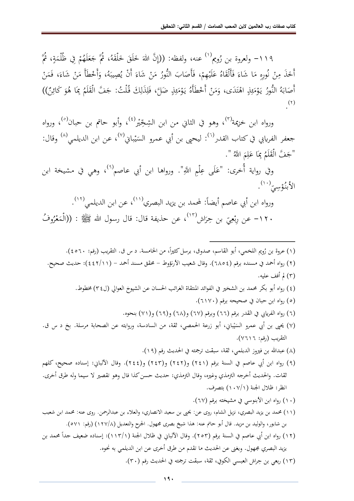 ١١٩ - ولعروة بن رُويم (¬١) عنه، ولفظه: "إِنَّ اللهَ خَلَقَ خَلْقَه، ثُمَّ جَعَلَهُمْ فِي ظُلْمَةٍ، ثُمَّ أَخَذَ مِنْ نُورِهِ مَا شَاءَ فَأَلْقَاهُ عَلَيْهِمْ، فَأَصَابَ النُّورُ مَنْ شَاءَ أَنْ يُصِيبَه، وَأَخْطَأَ مَنْ شَاءَ، فَمَنْ أَصَابَهُ النُّورُ يَوْمَئِذٍ اهْتَدَى، وَمَنْ أَخْطَأَهُ يَوْمَئِذٍ ضَلَّ، فَلِذَلِكَ قُلْتُ: جَفَّ الْقَلَمُ بِمَا هُوَ كَائِنٌ" (¬٢).