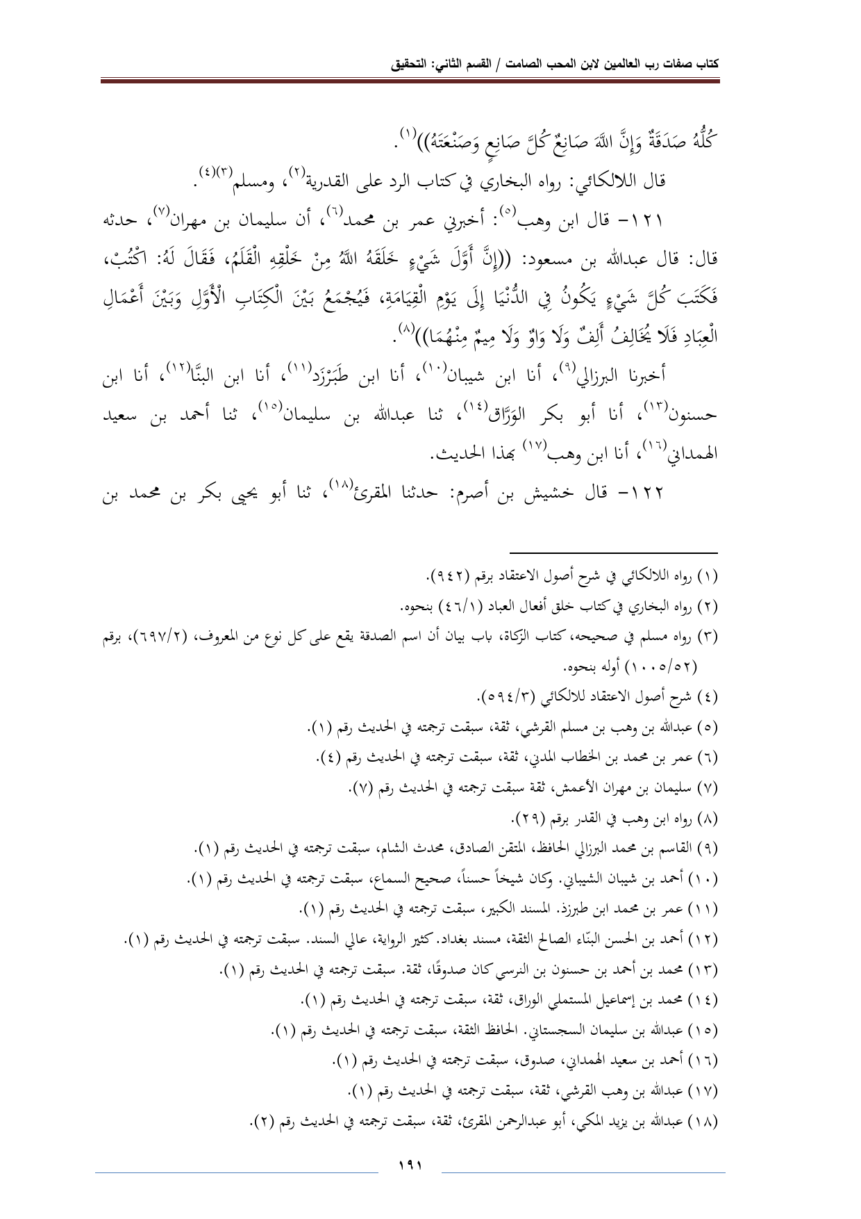 قال اللالكائي: رواه البخاري في كتاب الرد على القدرية (¬٢)، ومسلم (¬٣) (¬٤).