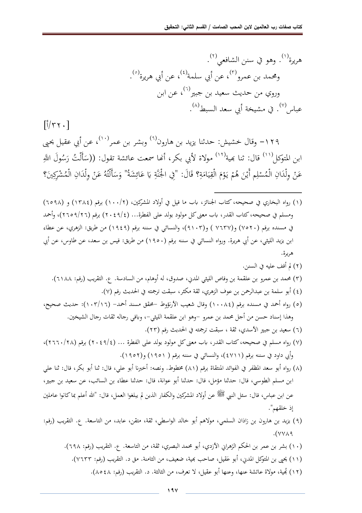 ١٢٩ - وقال خشيش: حدثنا يزيد بن هارون (¬٩) وبشر بن عمر (¬١٠)، عن أبي عميل يحيى بن المتوكل (¬١١) قال: ثنا بهية (¬١٢) مولاة لأبي بكر، أنها سمعت عائشة تقول: "سَأَلْتُ رَسُولَ اللَّهِ عَنْ وِلْدَانِ الْمُسْلِم أَيْنَ هُمْ يَوْمَ الْقِيَامَةِ؟ قَالَ: "فِي الْجنَّةِ يَا عَائِشَةُ" وَسَأَلْتُهُ عَنْ وِلْدَانِ الْمُشْركِينَ؟