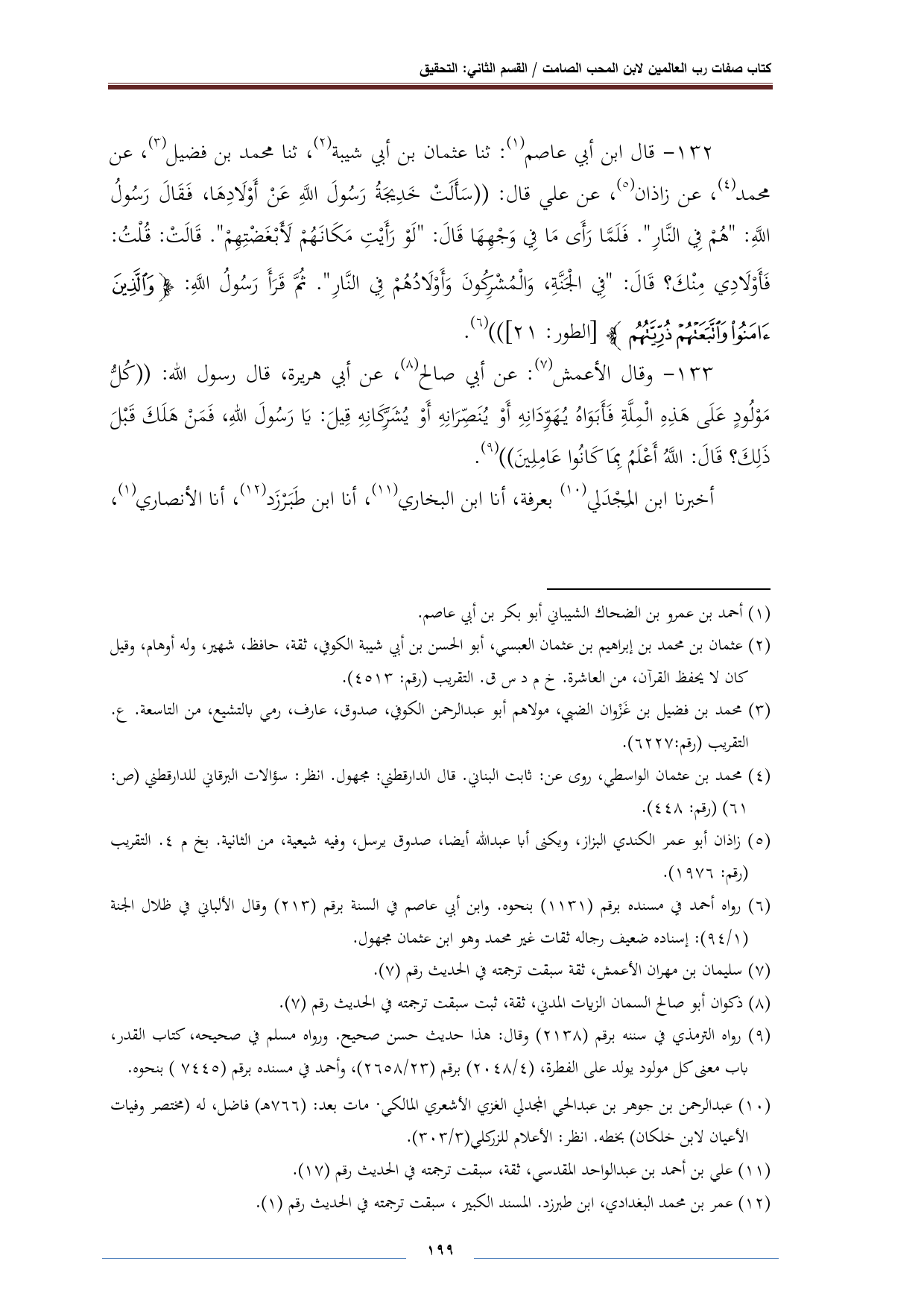 ١٣٢ - قال ابن أبي عاصم (¬١): ثنا عثمان بن أبي شيبة (¬٢)، ثنا محمد بن فضيل (¬٣)، عن محمد (¬٤)، عن زاذان (¬٥)، عن علي قال: "سَأَلَتْ خَدِيجَةُ رَسُولَ اللَّهِ عَنْ أَوْلَادِهَا، فَقَالَ رَسُولُ الله "هُمْ فِي النَّارِ". فَلَمَّا رَأَى مَا فِي وَجْهِهَا قَالَ: "لَوْ رَأَيْتِ مَكَانَهُمْ لأَبْغَضْتِهِمْ". قَالَتْ: قُلْتُ: فَأَوْلَادِي مِنْكَ؟ قَالَ: "فِي الْجَنَّةِ، وَالْمُشْرِكُونَ وَأَوْلَادُهُمْ فِي النَّارِ". ثُمَّ قَرَأَ رَسُولُ اللَّهِ: {وَالَّذِينَ آمَنُوا وَاتَّبَعَتْهُمْ ذُرِّيَّتُهُمْ} [الطور: ٢١] " (¬٦).