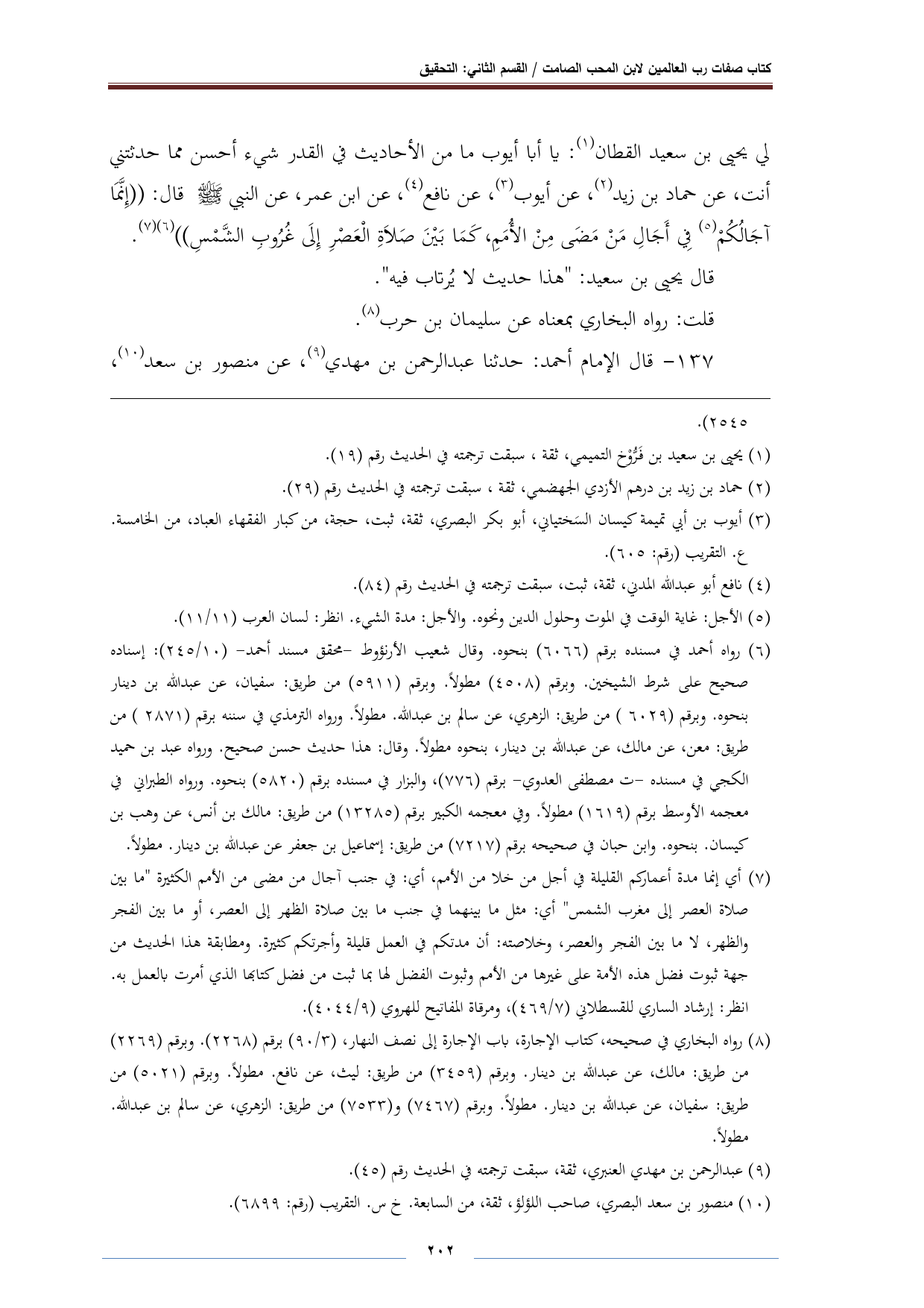 لي يحيى بن سعيد القطان (¬١): يا أبا أيوب ما من الأحاديث في القدر شيء أحسن مما حدثتني أنت، عن حماد بن زيد (¬٢)، عن أيوب (¬٣)، عن نافع (¬٤)، عن ابن عمر، عن النبي - صلى الله عليه وسلم - قال: "إِنَّمَا آجَالُكُمْ (¬٥) فِي أَجَالِ مَنْ مَضَى مِنْ الأُمَمِ، كَمَا بَيْنَ صَلاةِ الْعَصْرِ إِلَى غُرُوبِ الشَّمْسِ" (¬٦) (¬٧).